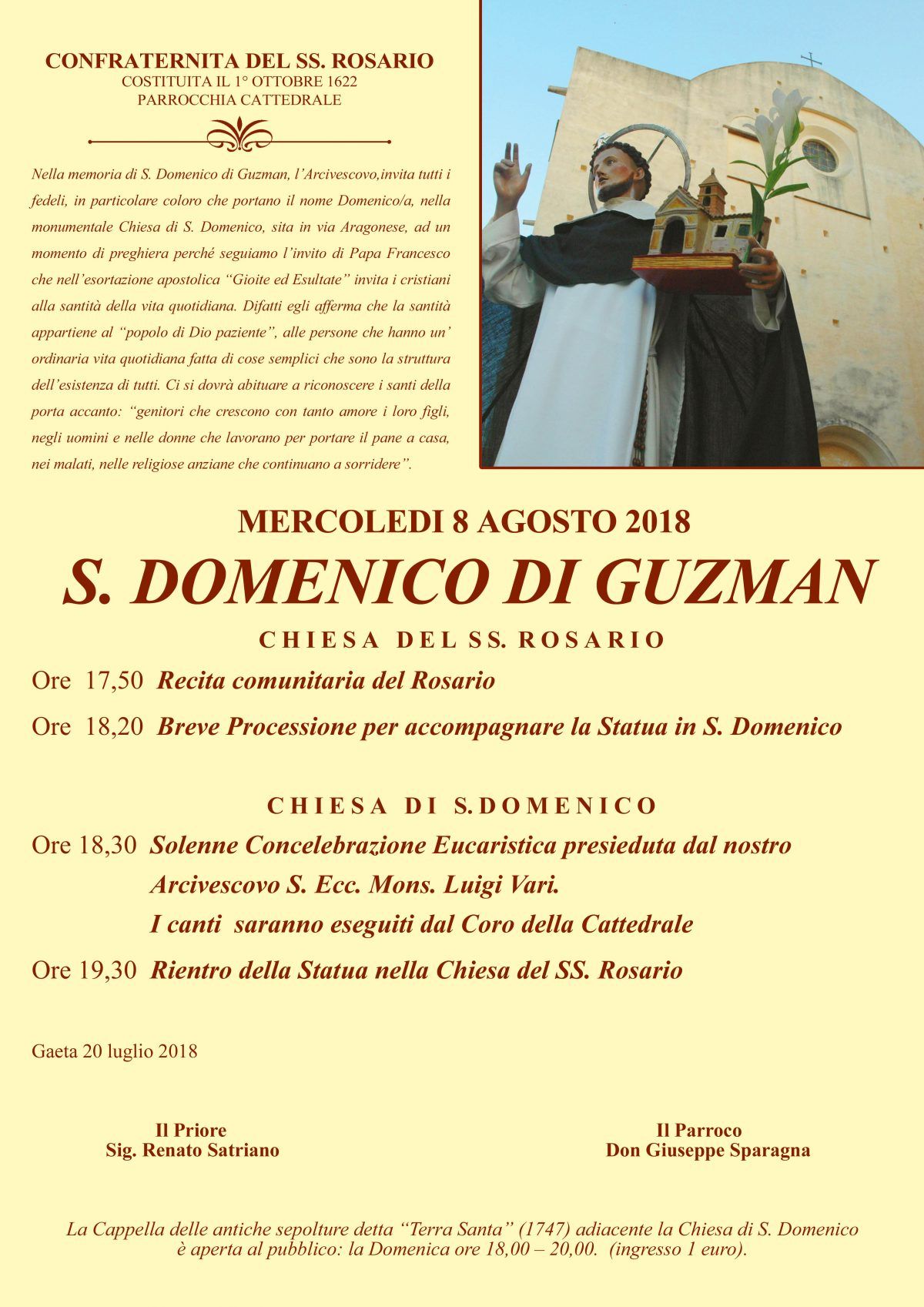 Nella memoria di San Domenico di Guzman, mercoledì 8 agosto l’arcivescovo di Gaeta Luigi Vari invita tutti i fedeli, in particolare coloro che portano il nome Domenico/a, nella monumentale chiesa di San Domenico, sita in via Aragonese a Gaeta, dove si terrà un momento di preghiera a cura della Confraternita del Santo Rosario di Gaeta, costituita il 1° ottobre 1622, guidata dal priore Renato Satriano.