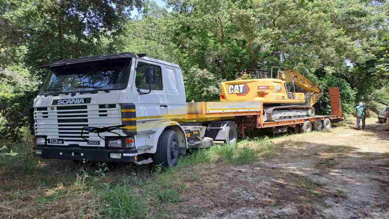 Ad intervenire alle porte di Sabaudia, cittadina in provincia di Latina, gli agenti della squadra di Polizia Giudiziaria del capoluogo pontino. Ai poliziotti non è certamente passata inosservata la presenza del mezzo industriale che, come anticipato, era nascosto tra la fitta vegetazione. Un complesso veicolare vero e proprio quello rinvenuto, composto da motrice, rimorchio e con sopra caricato un escavatore cingolato corredato della relativa benna. Ma non solo.