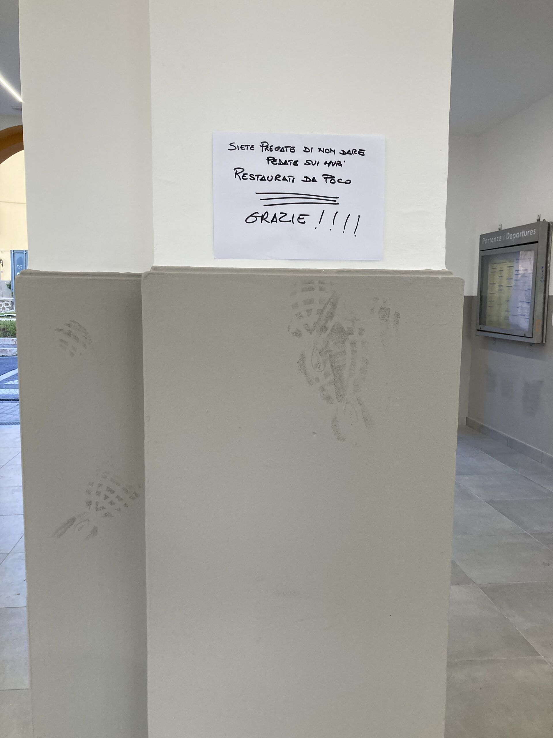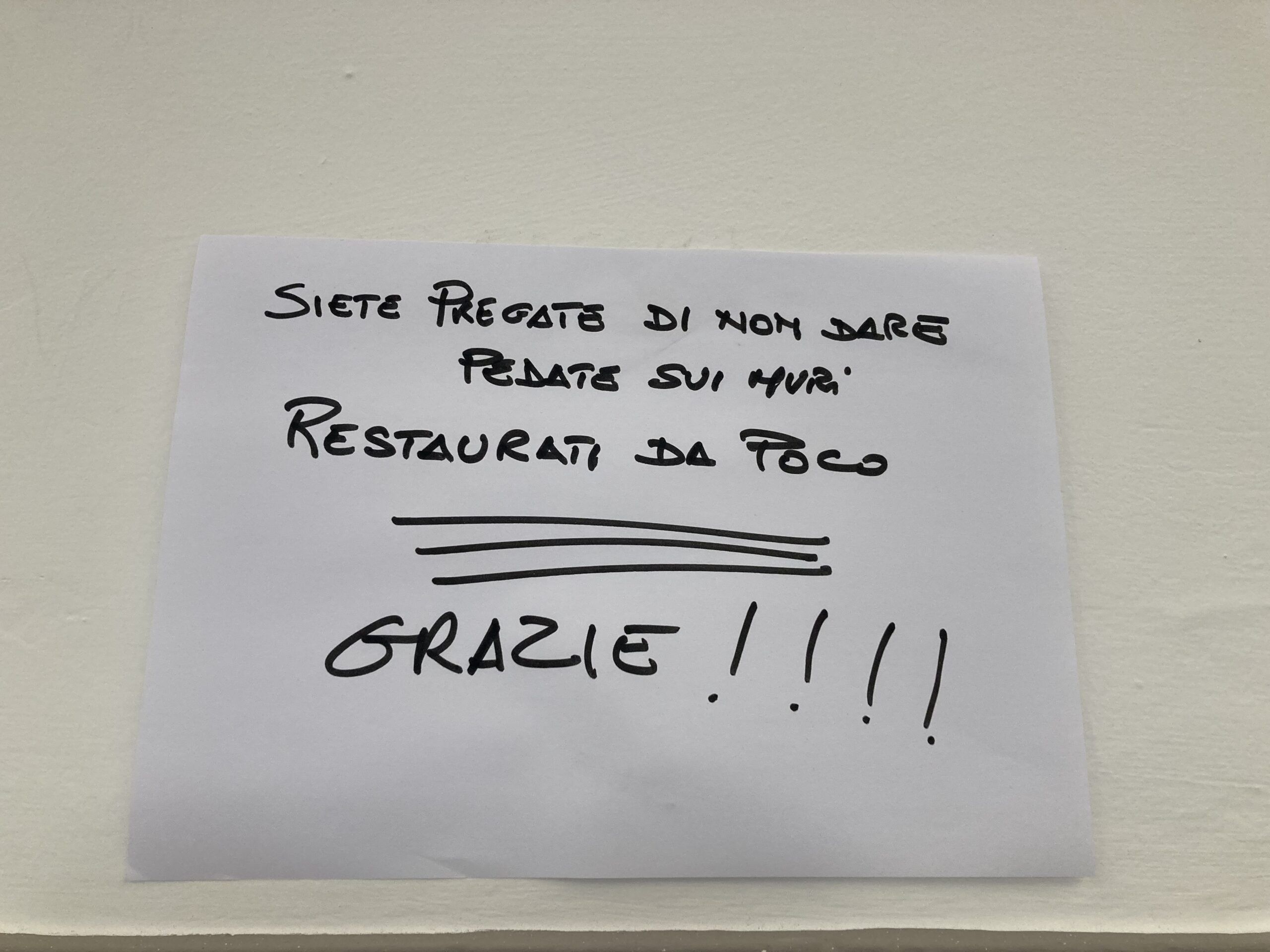 Tanto che qualcuno a cui è rimasto un po’ di senso civico, ha avuto il ‘coraggio’, nonchè il buon senso, di affiggere un foglio con su scritto “Siete pregati di non dare pedate sui muri restaurati da poco. Grazie!!!”, in ogni punto in cui compariva lo sfregio.