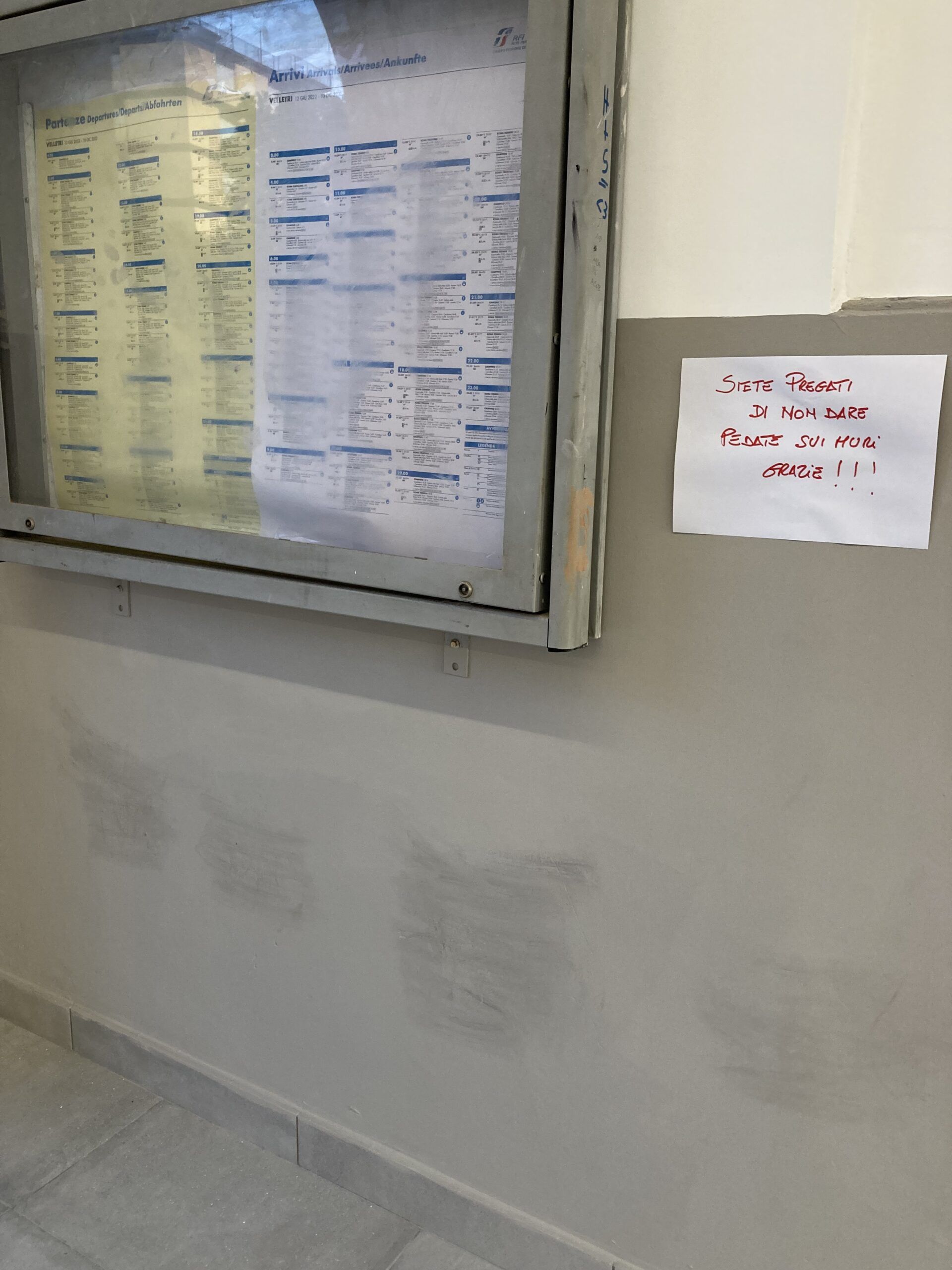 Muri freschi di vernice bianca e già ‘decorati’ con impronte di scarpe. E’ così che si presenta l’atrio della stazione di Velletri, in provincia di Roma, all’ indomani dalla fine dei lavori di ristrutturazione. La stazione ferroviaria non ha fatto in tempo a rimettersi a nuovo che già è stata vandalizzata con pedate.