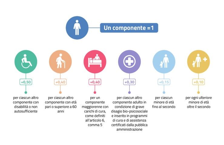 Per quanto riguarda la condizione economica la famiglia non deve avere un ISEE superiore a 9.360 euro. Inoltre il valore del reddito familiare deve essere inferiore alla soglia di 6.000 euro annui (7.560 in presenza di determinate condizioni), moltiplicata tuttavia per il corrispondente parametro di una scala di equivalenza. Un po’ come accadeva con il Reddito di Cittadinanza. Di seguito due infografiche che spiegano nel dettaglio la metodologia di calcolo.