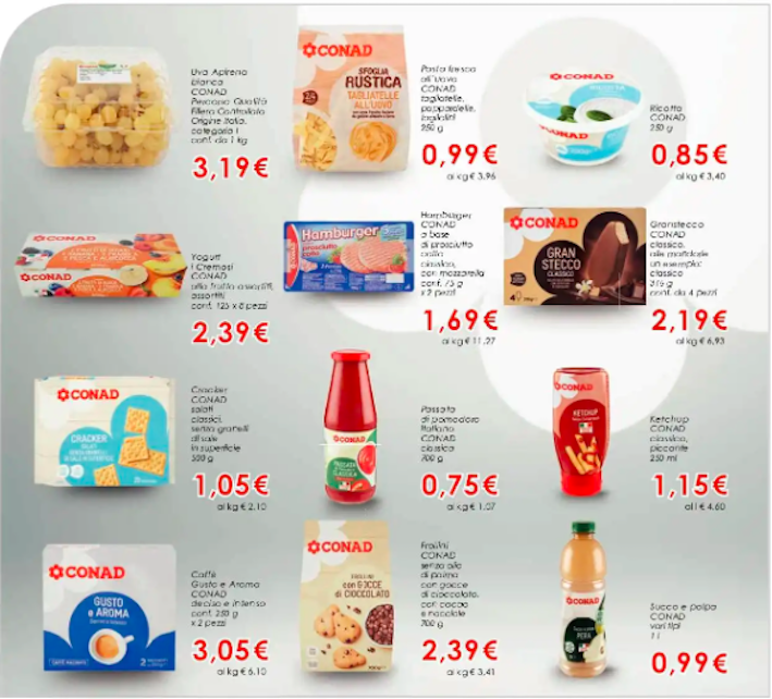 L’offerta ha un nome che è tutto un programma: ”7 Giorni Folli” e dura dal 31 agosto sino al 6 settembre. Dunque, c’è ancora tempo e margine per fare un capatina presso i negozi Conad.  In questo Volantino Conad abbiamo trovato prodotti super convenienti, come ad esempio: Pasta all’uovo a 0.99€, Crackers a 1.05€, Uva a 3.19€, Pesche a 1.99€, Melone Retato a 1.19€, Trancio di Salmone a 14.90€, Grana Padano a 2.99€, Ketchup a 1.15€, Ricotta a 0.85€, Passata di Pomodoro a 0.75€, Cornetto Algida a 2.99€, Birra Peroni a 0.85€, Tonno Nostromo a 4.45€, e molto altro.