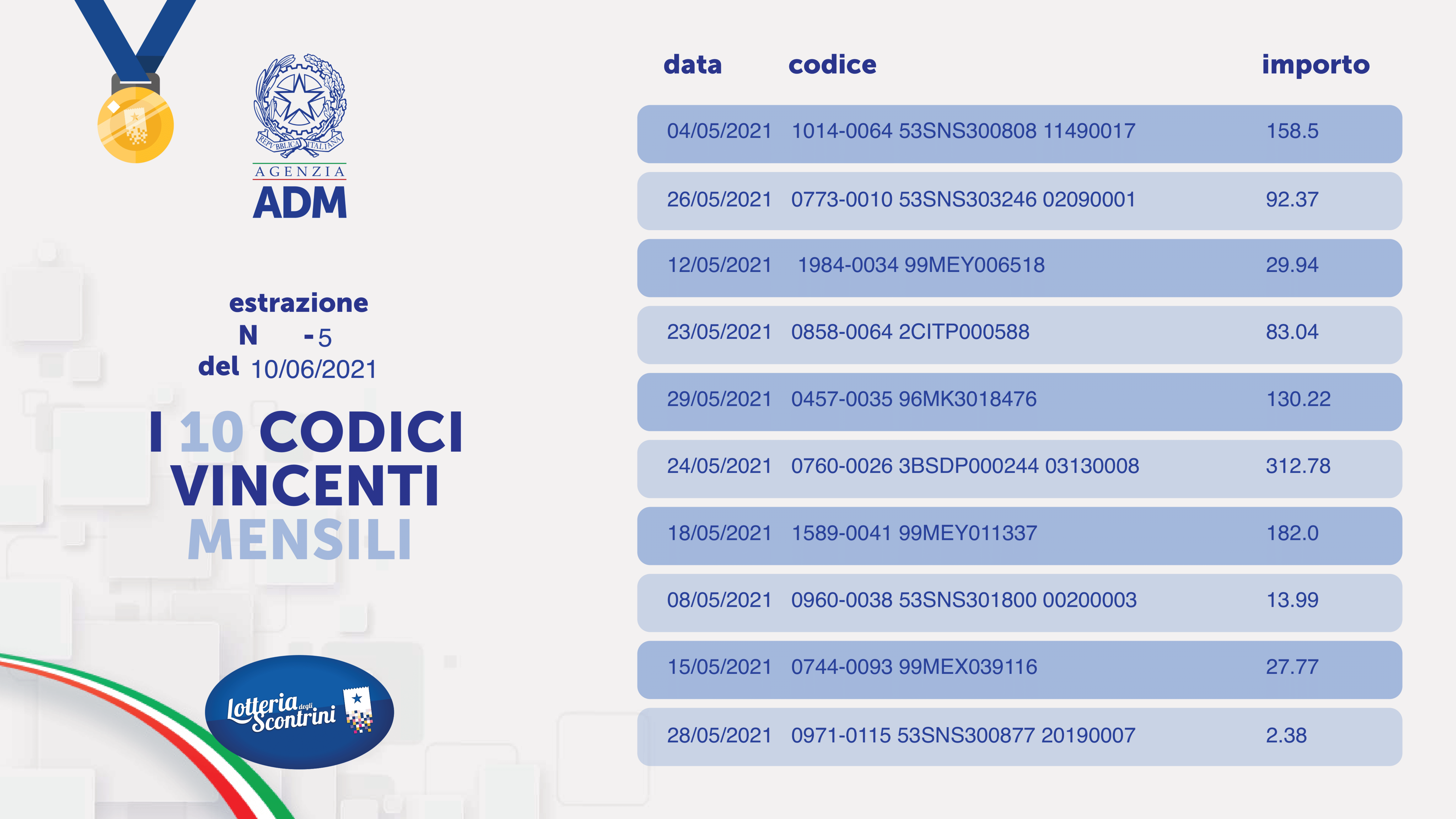 Nel 2021 le estrazioni settimanali prevedono ulteriori premi: 25 premi ogni settimana da 10.000 euro per gli acquirenti e 25 premi da 2.000 euro per gli esercenti. Nelle estrazioni del 12 agosto 2021 e del 30 dicembre 2021 saranno inoltre assegnati 5 maxi premi di 150.000 euro per chi compra e 5 maxi premi di 30.000 euro per chi vende.