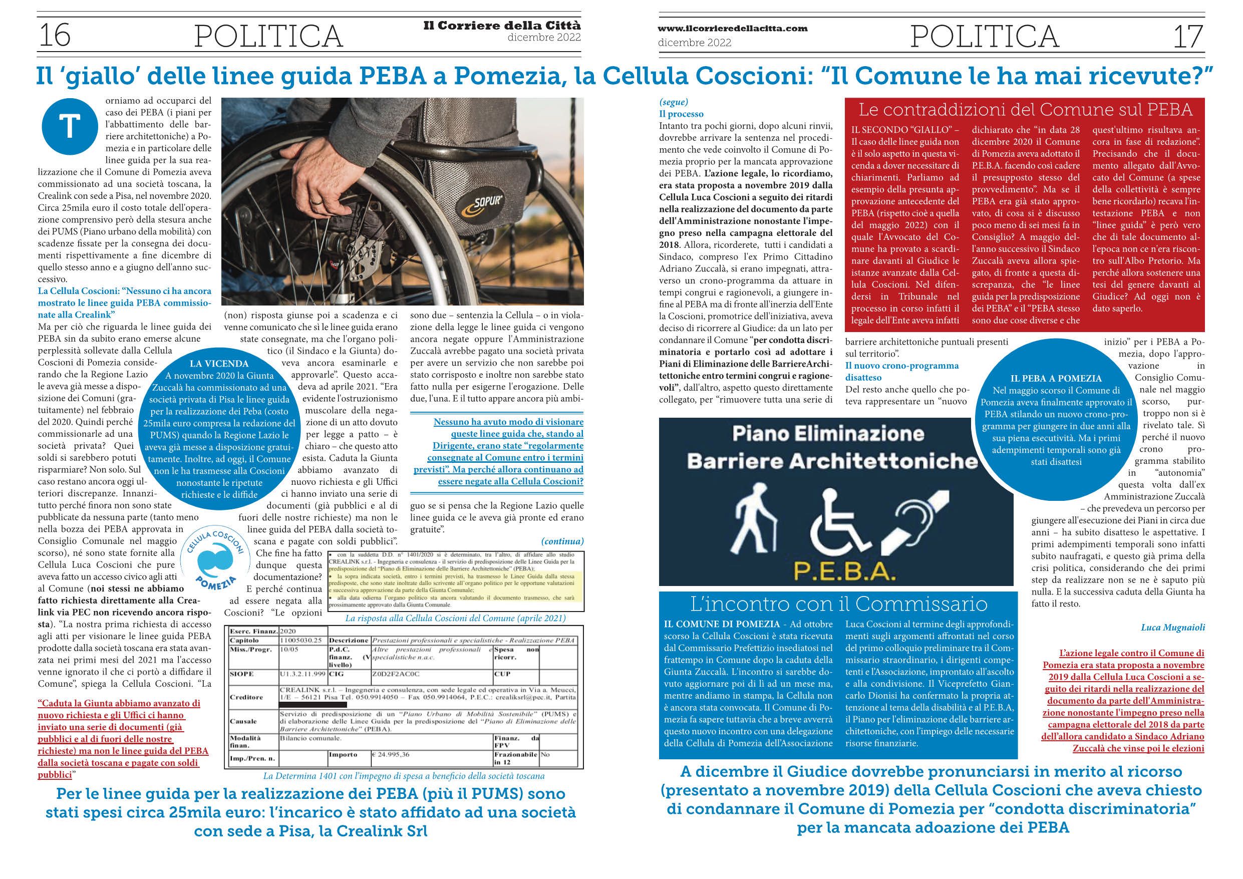 Torniamo ad occuparci del caso dei PEBA (i piani per l’abbattimento delle barriere architettoniche) a Pomezia e in particolare delle linee guida per la sua realizzazione che il Comune di Pomezia aveva commissionato ad una società toscana, la Crealink con sede a Pisa, nel novembre 2020. Circa 25mila euro il costo totale dell’operazione comprensivo però della stesura anche dei PUMS (Piano urbano della mobilità) con scadenze fissate per la consegna dei documenti rispettivamente a fine dicembre di quello stesso anno e a giugno dell’anno successivo.