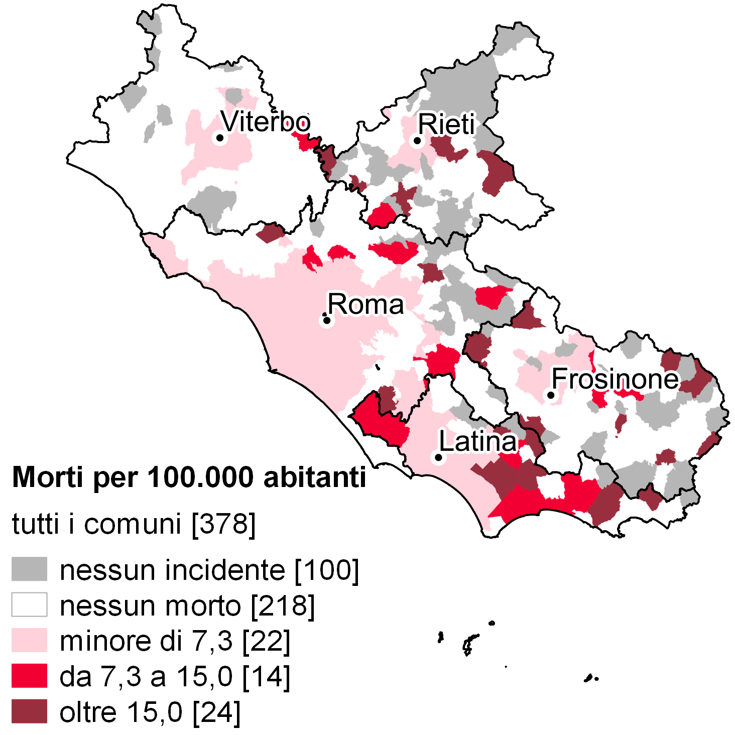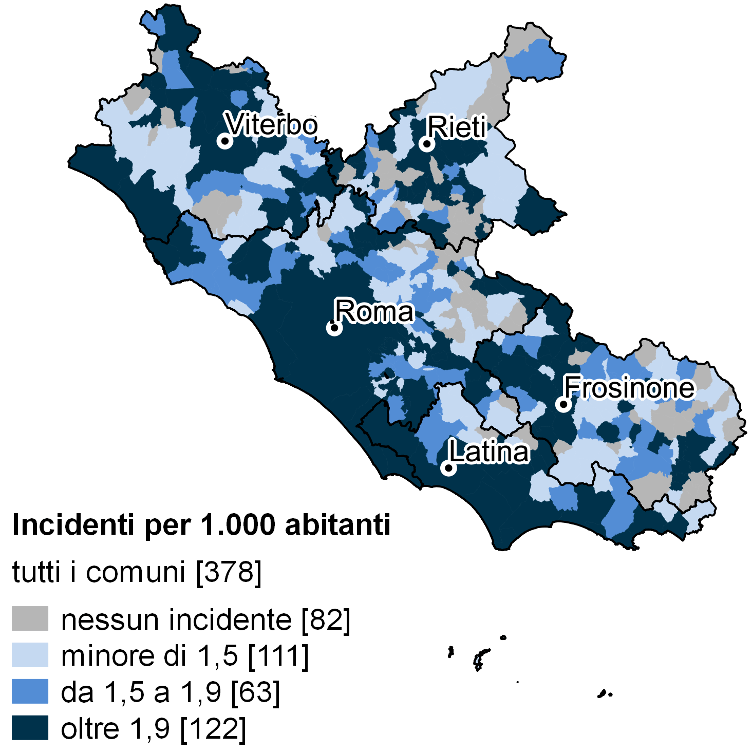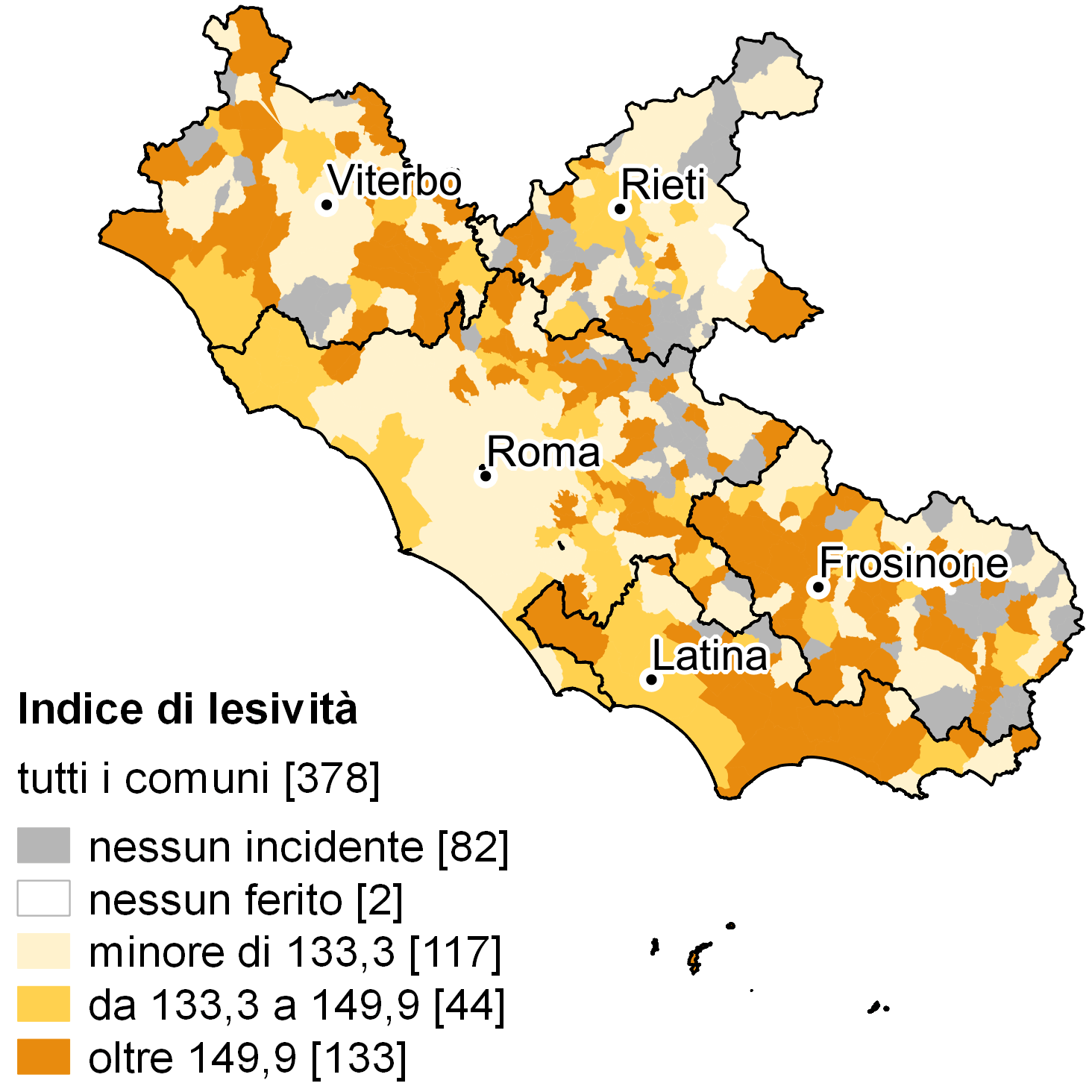 L’incidentalità stradale è più alta nei capoluoghi, sul litorale e nelle province di Roma, di Frosinone e di Rieti, dove si concentrano i comuni in cui sono verificati più di 1,9 incidenti ogni 1.000 abitanti. Gli indici di mortalità (numero di morti e il numero di incidenti con lesioni a persone, moltiplicato per 100) e di gravità (Rapporto tra il numero di morti e la somma di morti e feriti, moltiplicato per 100) raggiungono i valori più elevati (rispettivamente, oltre 9 morti ogni 100 incidenti stradali e 5,1 morti ogni 100 persone morte o ferite in incidenti stradali), soprattutto tra i comuni delle province di Frosinone e Latina. L’indice di lesività (numero di feriti/numero incidenti con lesioni a persone sempre x 100) raggiunge invece valori più elevati (oltre 149,9 feriti ogni 100 incidenti stradali) nei comuni situati prevalentemente nelle province di Frosinone e Roma. Nel 2021 il maggior numero di incidenti (13.414, il 76,7% del totale) si è verificato sulle strade urbane, provocando 161 morti (55,9% del totale) e 16.918 feriti (73,4%).