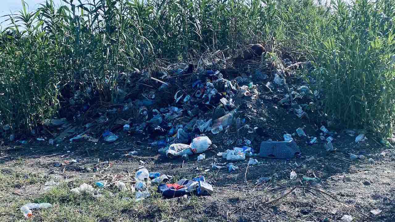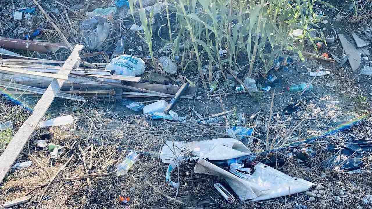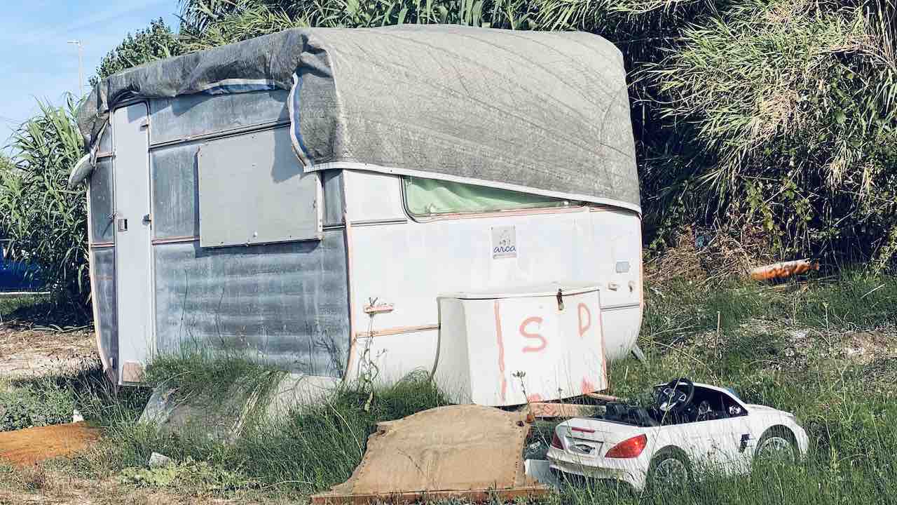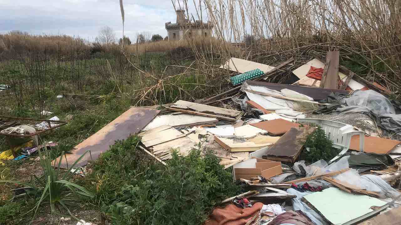Passando oltre il canneto, addentrandosi verso l’interno, ci si ritrova immersi non solo nel verde, ma anche nei rifiuti. Qui si trovano tracce di incendi, tende e casupole, e poi ancora decine di altre discariche. Reti, materassi, mobili, calcinacci, materiale ferroso, passeggini, carrelli della spesa, bombole del gas. Si può trovare di tutto. La vegetazione in molti punti è devastata. Uno spettacolo desolante. Altre due roulotte e una tenda sono a bordo strada, anche queste circondate da rifiuti.