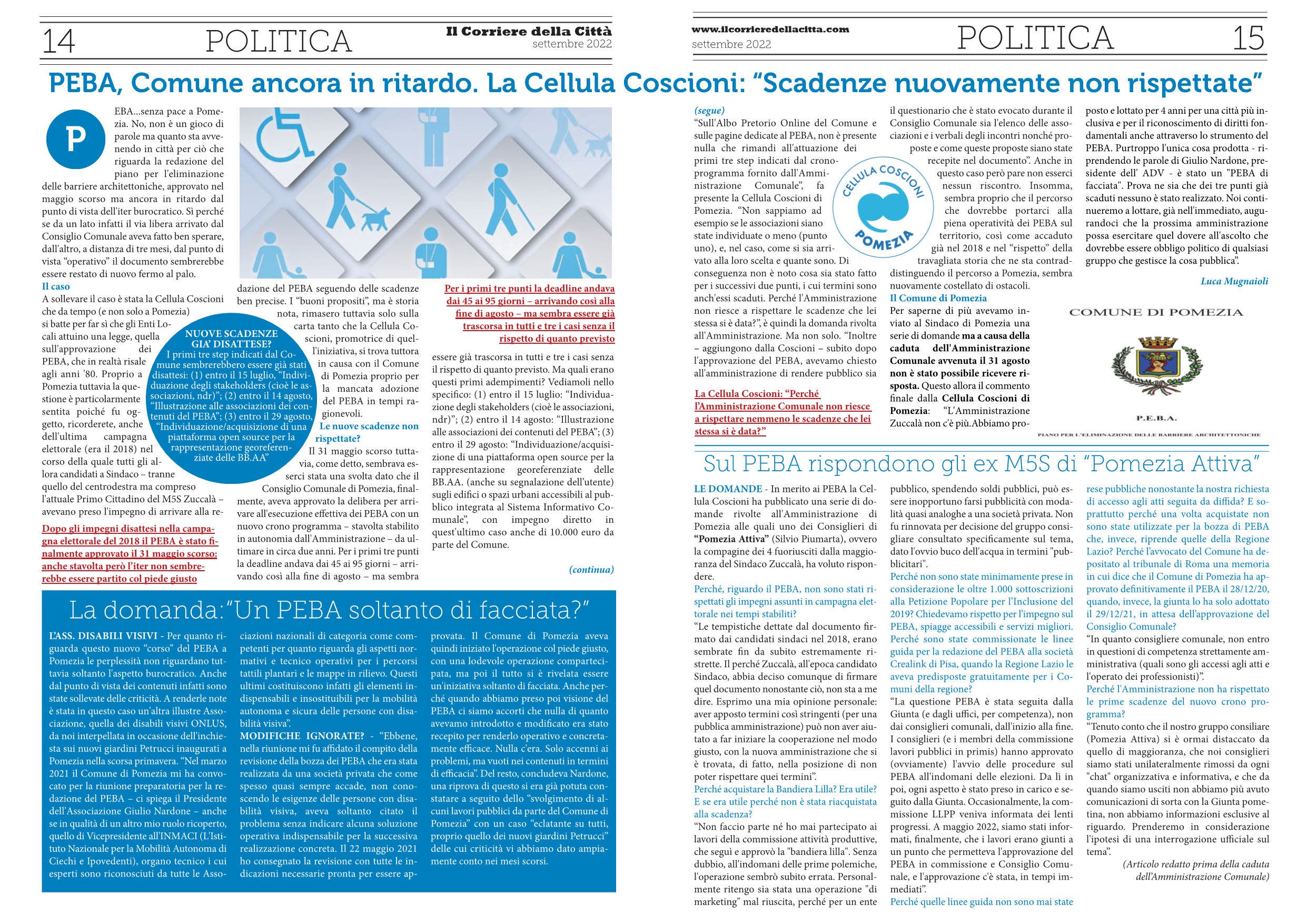 A sollevare il caso è stata la Cellula Coscioni che da tempo (e non solo a Pomezia) si batte per far sì che gli Enti Locali attuino una legge, quella sull’approvazione dei PEBA, che in realtà risale agli anni ’80. Proprio a Pomezia tuttavia la questione è particolarmente sentita poiché fu oggetto, ricorderete, anche dell’ultima campagna elettorale (era il 2018) nel corso della quale tutti gli allora candidati a Sindaco – tranne quello del centrodestra ma compreso l’attuale Primo Cittadino del M5S Zuccalà – avevano preso l’impegno di arrivare alla redazione del PEBA seguendo delle scadenze ben precise. I “buoni propositi”, ma è storia nota, rimasero tuttavia solo sulla carta tanto che la Cellula Coscioni, promotrice di quell’iniziativa, si trova tuttora in causa con il Comune di Pomezia proprio per la mancata adozione del PEBA in tempi ragionevoli.