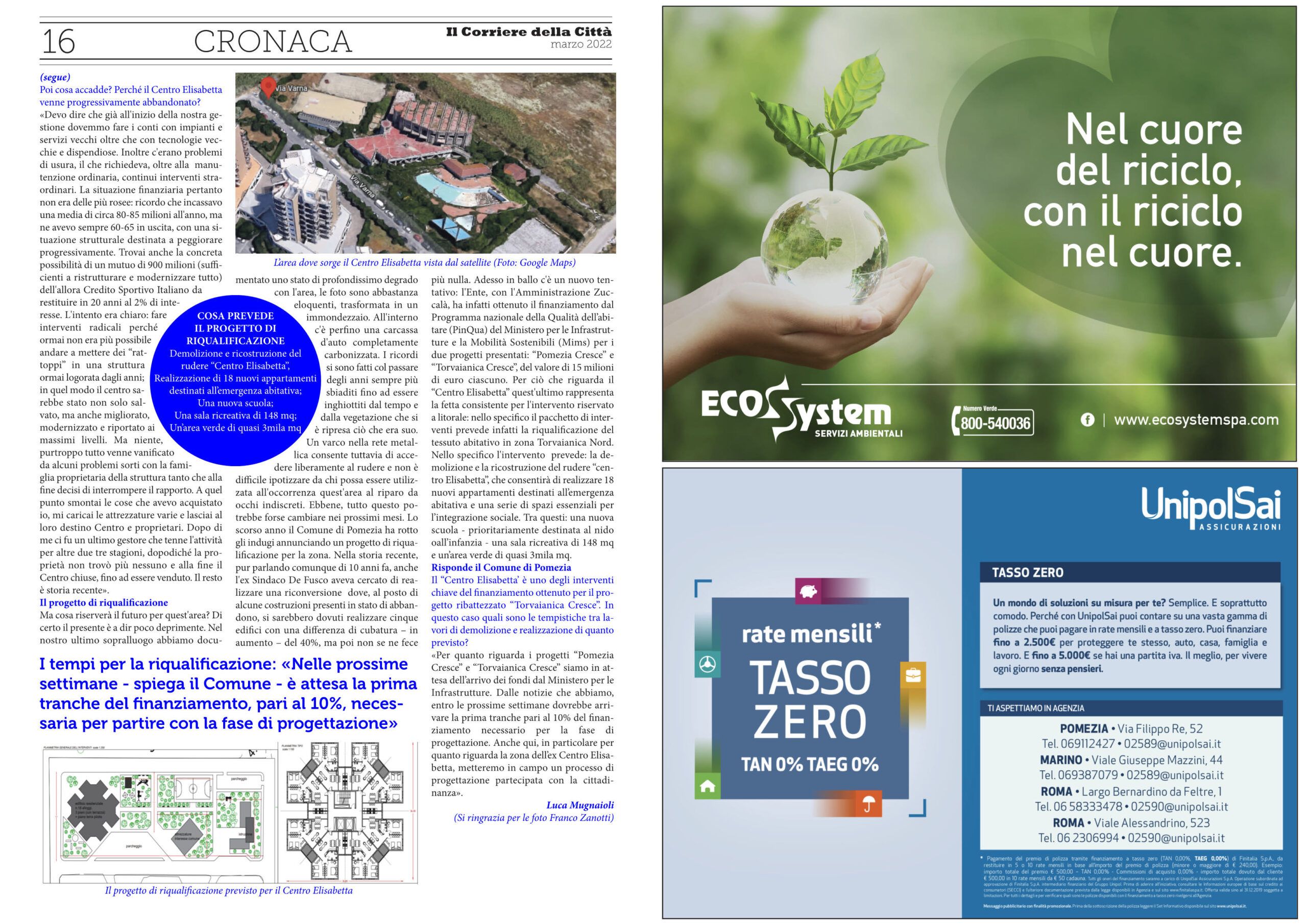 «Per quanto riguarda i progetti “Pomezia Cresce” e “Torvaianica Cresce” siamo in attesa dell’arrivo dei fondi dal Ministero per le Infrastrutture. Dalle notizie che abbiamo, entro le prossime settimane dovrebbe arrivare la prima tranche pari al 10% del finanziamento necessario per la fase di progettazione. Anche qui, in particolare per quanto riguarda la zona dell’ex Centro Elisabetta, metteremo in campo un processo di progettazione partecipata con la cittadinanza».