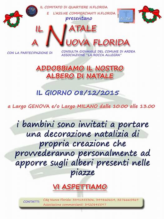 Finalmente ! È il sospiro di tanti cittadini che dopo tempo cominciano a veder muoversi qualcosa, comimciano a vedere il fiorire di iniziative, grandi e piccole, un’ pò qui e un’ pò lì, che per la gioia di tutti i bambini si prefiggono di colorare il quartiere di Nuova Florida, renderlo vivo e vivace. Dopo un programma di massima che è stato presentato al comune e diffuso sui social si parte finalmente con il primo atteso evento che vedrà decorare l’albero di Natale del quartiere, sistemato dal Comune in Largo Milano, con ogni tipo di manufatto ed oggetto portato direttamente dai bambini del territorio. Per l’occasione il Comitato di Quartiere Nuova Florida e l’Associazione Commercianti Nuova Florida, organizzatori dell’evento, hanno anche coinvolto la Consulta Giovanile del Comune di Ardea e La Rocca Allegra che offriranno intrattenimento a tutti gli intervenuti. Che altro dire? Accorrete numerosi, rendete magico e splendido il Natale a Nuova Florida!