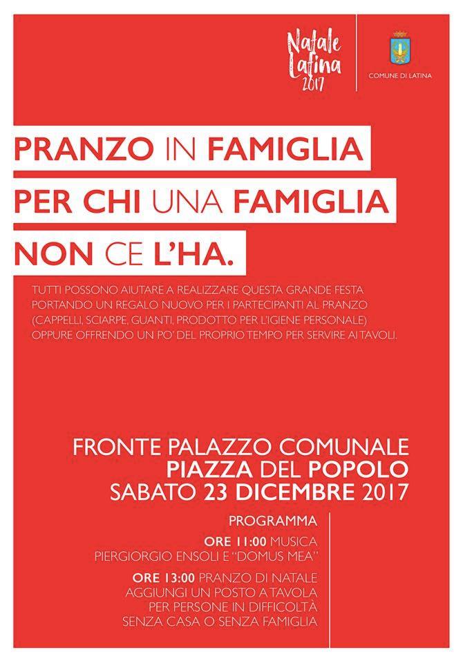 «L’iniziativa vuole essere una festa della solidarietà – spiega l’Assessora al Welfare Patrizia Ciccarelli – Davanti al portone del Palazzo civico, all’interno di due tende messe a disposizione dall’Associazione Nazionale Alpini, ci saranno panche e tavoli, oltre al pranzo ci sarà musica dal vivo con Piergiorgio Ensoli e il gruppo Musicantiere e si potrà partecipare ad una tombolata con estrazione dei numeri affidata al regista Renato Chiocca. Invito tutti i cittadini e le cittadine ad essere presenti. Tutti possono dare una mano per realizzare questa grande festa portando un regalo nuovo per gli invitati al pranzo – vanno bene cappelli, sciarpe, guanti, prodotti per l’igiene personale – oppure offrendo un po’ del proprio tempo anche per servire ai tavoli. Sarà un’occasione per stare insieme e per narrare meglio la realtà di chi vive per strada, è ricoverato in un centro o soffre di solitudine».
