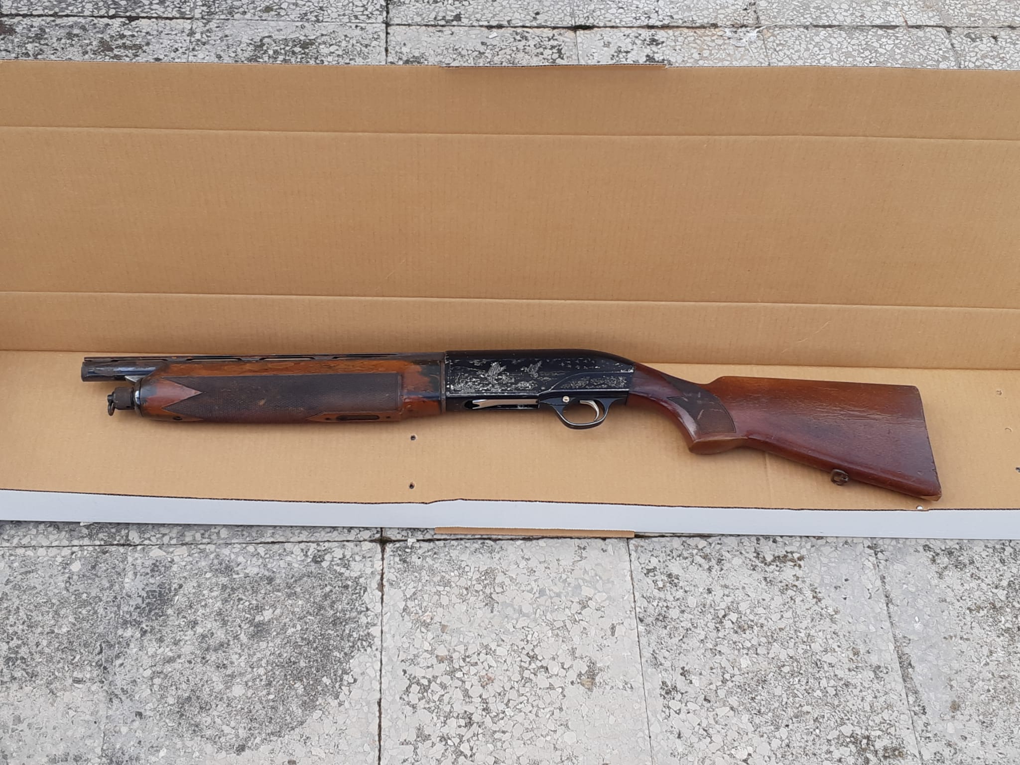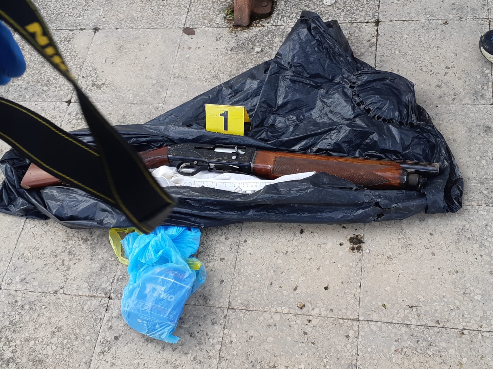 È stata quindi eseguita una minuziosa perquisizione presso la sua abitazione al fine di reperire eventuali elementi utili alle indagini, all’esito della quale è stato rinvenuto un fucile a canne mozze calibro 12 con 18 cartucce (illegalmente detenuti e sulla cui provenienza sono in corso approfondimenti investigativi), una perfetta riproduzione di una pistola Beretta identica a quelle in dotazione alle forze di polizia e un grosso coltello da cucina; con lama di circa 30 cm, occultato dietro le mattonelle della vasca da bagno. Tutto il materiale è stato posto in sequestro e accuratamente repertato da personale della Polizia Scientifica, anche per le successive comparazioni balistiche.