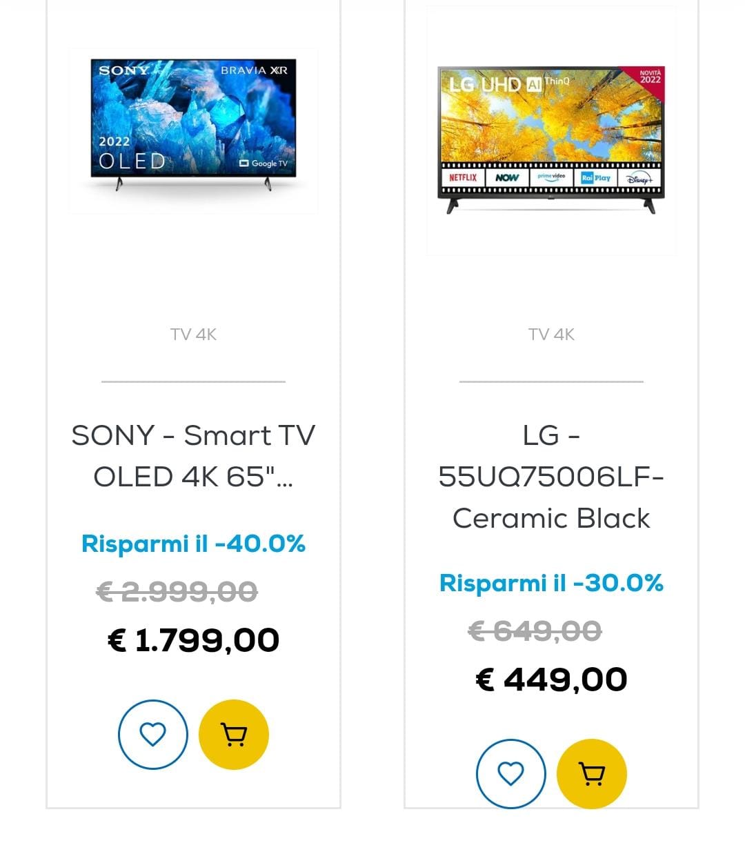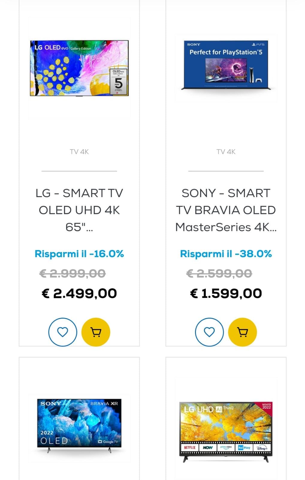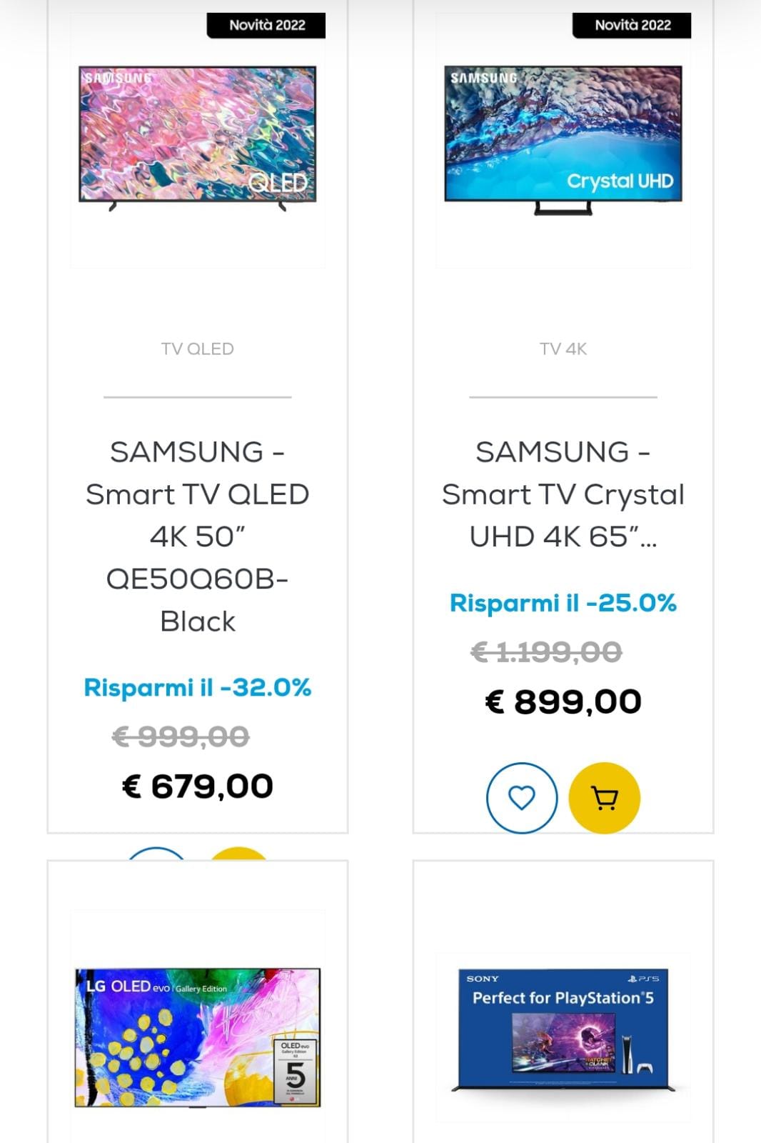 Tra i prodotti in promozione da Euronics segnaliamo l’ampia gamma delle smart tv. Ad esempio, il televisore LG OLED costa 1.018 invece che 1.999.00 mentre la tv HISENSE è a 649 euro invece che a 999 come da listino. Ancora, un interessante promozione sempre su una televisione a marchio HISENSE che costa 249 euro invece che 399 euro. Di seguito alcune foto di alcune delle promozioni attive da Euronics. Si ricorda che tutte le offerte disponibili da Euronics sono consultabili cliccando QUI