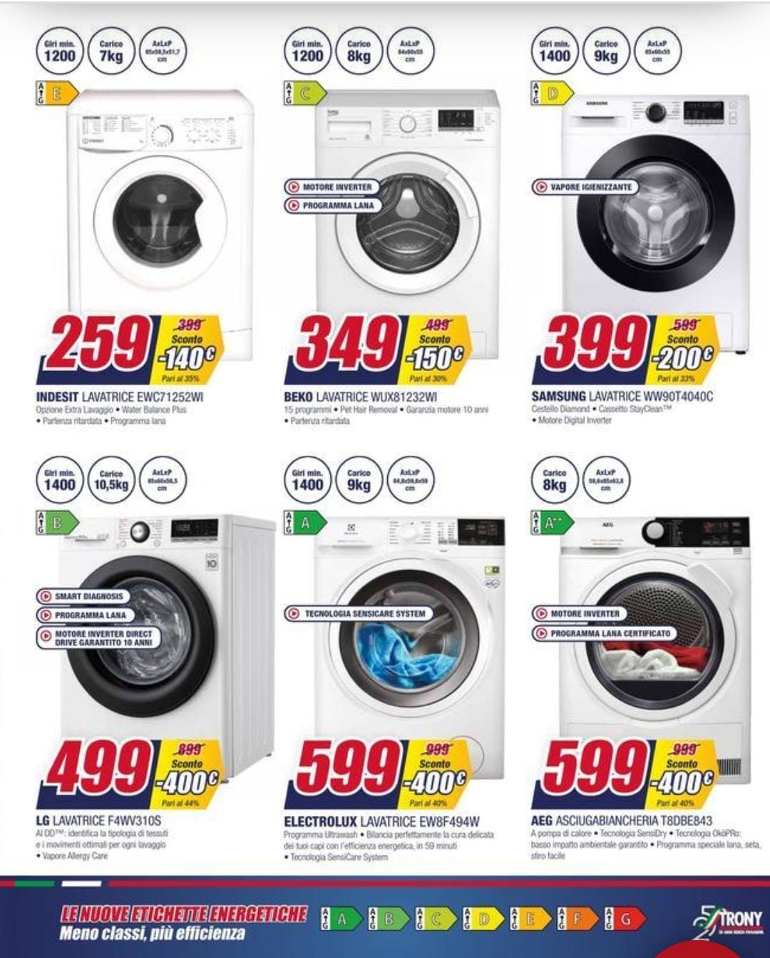 Riportiamo di seguito alcuni prodotti del volantino ‘Trony Days Sconti Senza Paragoni’. Come si noterà, c’è davvero l’imbarazzo della scelta: le offerte infatti spaziano dai telefoni cellulari fino ad arrivare ai grandi elettrodomestici come le lavatrici.