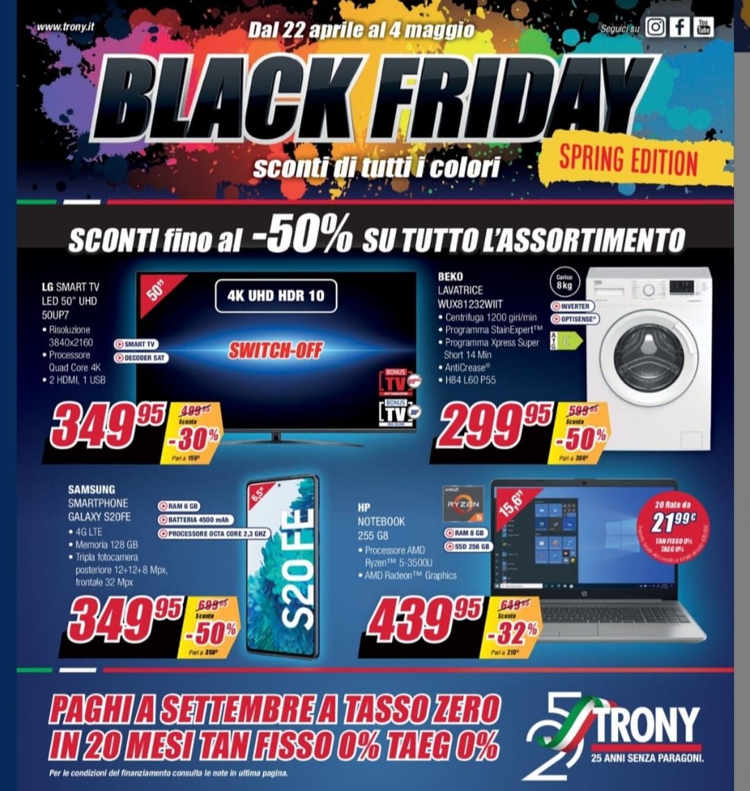 Arriva il volantino ‘Black Friday Spring Edition‘ di Trony! Una pioggia di offerte è pronta ad investire i consumatori che così possono portarsi a casa numerosi oggetti ad un prezzo davvero imbattibile! La promozione è iniziata il 22 aprile e sarà valida fino al prossimo 4 maggio.