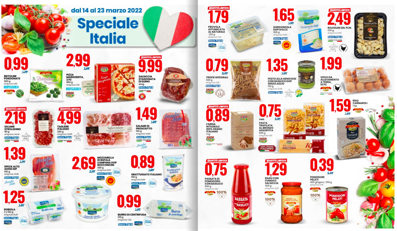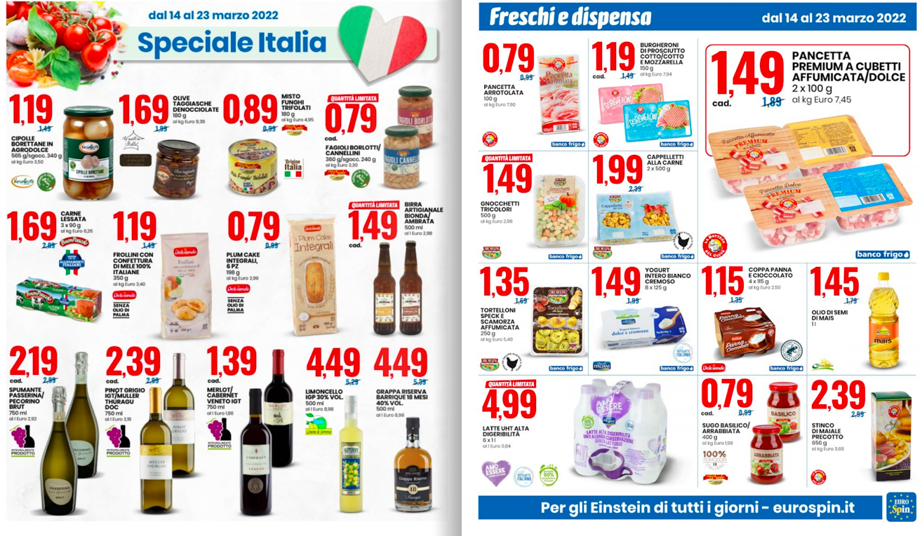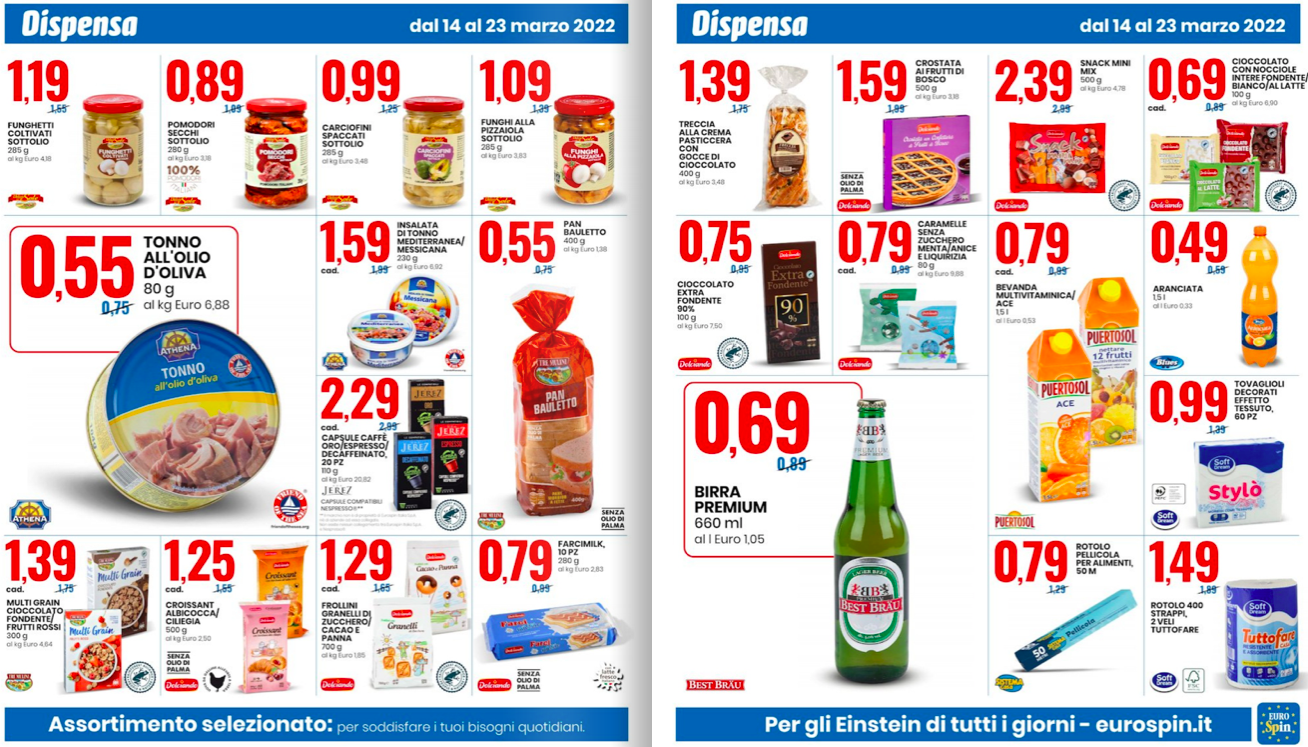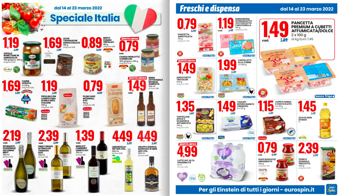 Volantino Eurospin. Grandiose offerte in vista su tutti i prodotti, e per gran parte del mese, precisamente dal 14 al 23 marzo 2022. Tanti prodotti tipici dalle regioni italiane da scoprire nelle promozioni ”Speciale Italia”, oppure diversi snack da gustare con gli amici a offerte pazzesche nelle promozioni ”Speciale Aperitivo”, come olive verdi denocciolate, grissini, cubetti di formaggio, mini salamini e molto altro ancora.