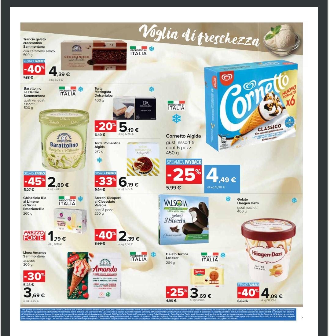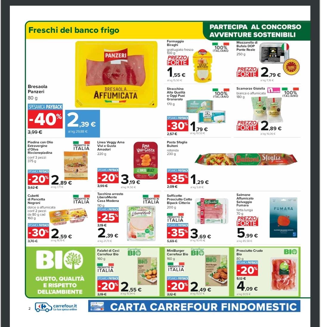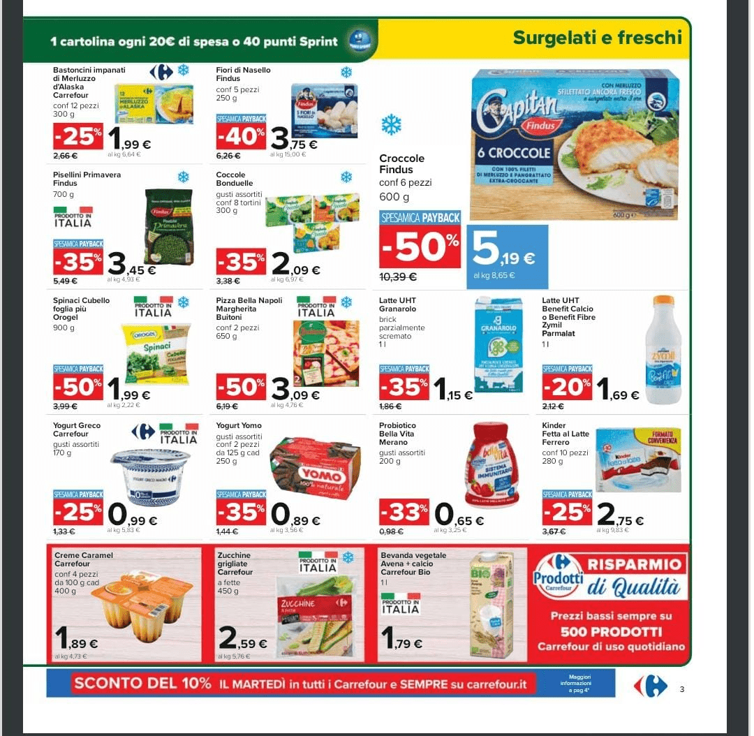 Tra i prodotti alimentari in promozione abbiamo per esempio la sfoglia Buitoni a 1.29 euro, scontata del 35%, lo stracchino alta qualità o Oggi Puoi Granarolo a 1.79 euro, scontato del 30% e la mozzarella di Bufala DOP Ponte Reale a 2.79 euro. Nel reparto surgelati si segnala invece, scontato del 50% con la carta payback, le Croccole Findus che costano 5.99 euro. Invece, i bastoncini di Merluzzo a marchio Findus a 1.99 euro. Questo solo un piccolo assaggino si quanto è possibile trovare nel supermercato, occorre dunque affrettarsi e non lasciare scappare queste ghiotte occasioni. Di seguito riportiamo alcune foto dei prodotti in sconto.