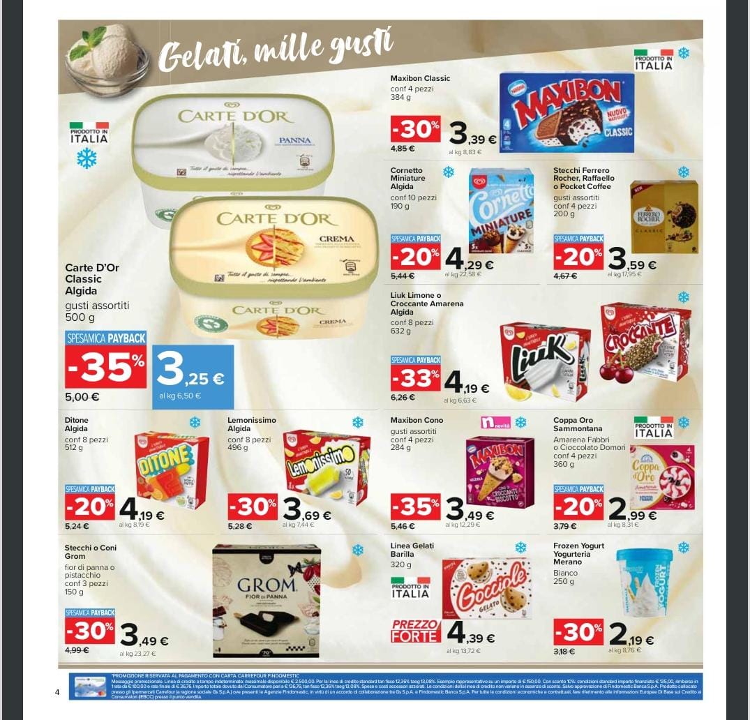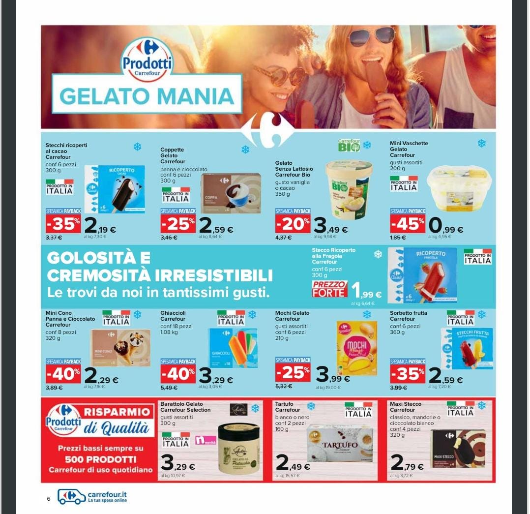 Attivo da domani, lunedì 5 giugno e fino alla metà del mese il nuovo volantino Iper Carrefour! Al suo interno numerosissime promozioni che consentiranno ai consumatori di portarsi a casa innumerevoli prodotti a prezzi davvero imbattili e vantaggiosi. Promozioni e sconti riguardano il banco frigo, quello dei surgelati e freschi e tante golose offerte valide anche sui gelati che in questo periodo dell’anno rappresentano davvero un dolce toccasana oltre che un fresco dessert! Vediamo ora insieme alcuni dei prodotti in promozione.