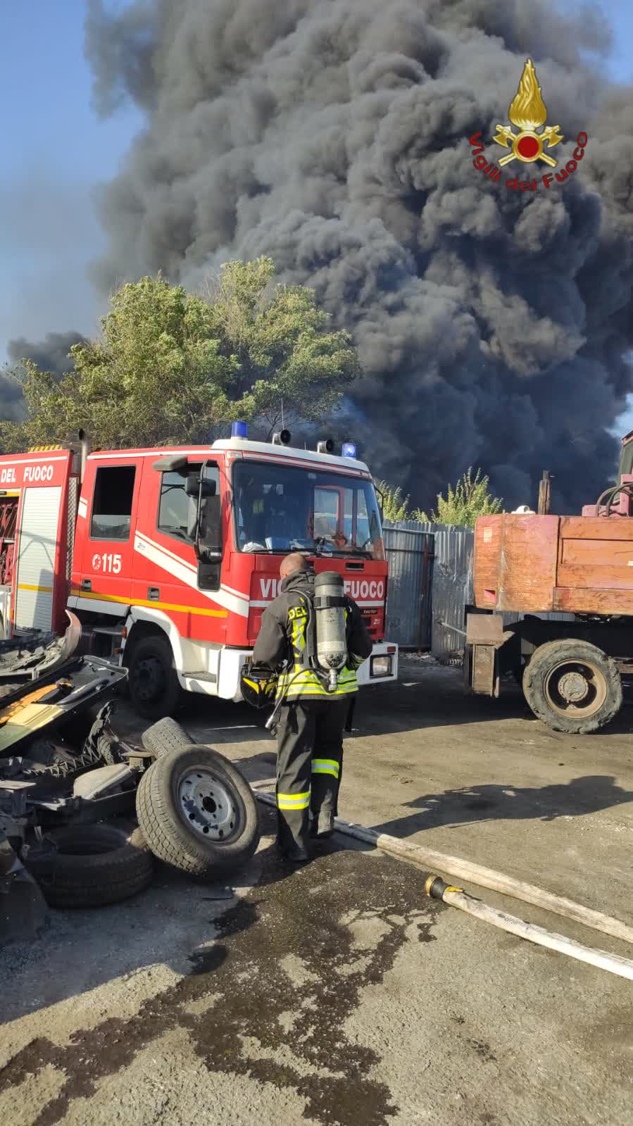 Alle ore 17:30 circa, la Sala Operativa del Comando VV.F. di Roma ha inviato tre squadre operative, un’autobotte e il TA/6 in Via Giarratana per l’incendio di un’autodemolitore.