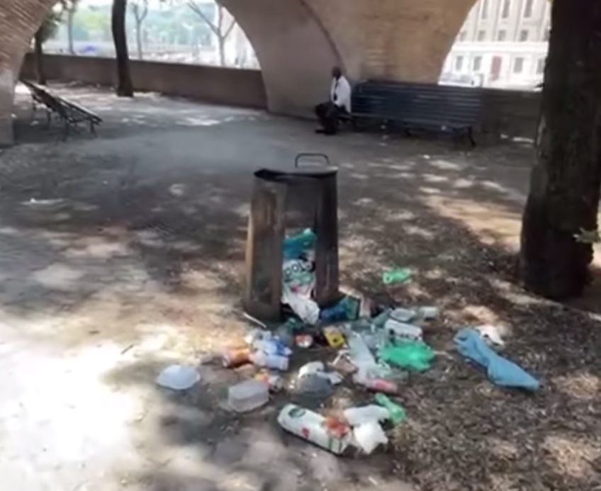 È allarme rifiuti a Castel Sant’Angelo, il meraviglioso monumento che sorge sulla sponda destra del Tevere. Tra i luoghi più importanti della Capitale, a due passi dal Vaticano, il mausoleo di Adriano è purtoppo invaso da rifiuti di ogni genere: cumuli di aghi di pino misti a sporcizia, sacchetti e bottigliette di plastica, cartacce e cestini dell’immondizia strabordanti, il cui contenuto è riverso per terra. Un vero e proprio accampamento sorge poi all’interno dello splendido monumento dove è purtroppo possibile osservare gente che bivacca, delle tende e persino dei panni stesi ad asciugare. Non macano inoltre i numerosi tronchi di alberi tagliati e mai rimpiazzati. Uno scenario desolante e a dir poco incredibile, se non lo si osservasse con i propri occhi. A segnalare il degrado Fabrizio Santori, attraverso un video di denuncia che testimonia lo stato in cui riversa tutta la zona.