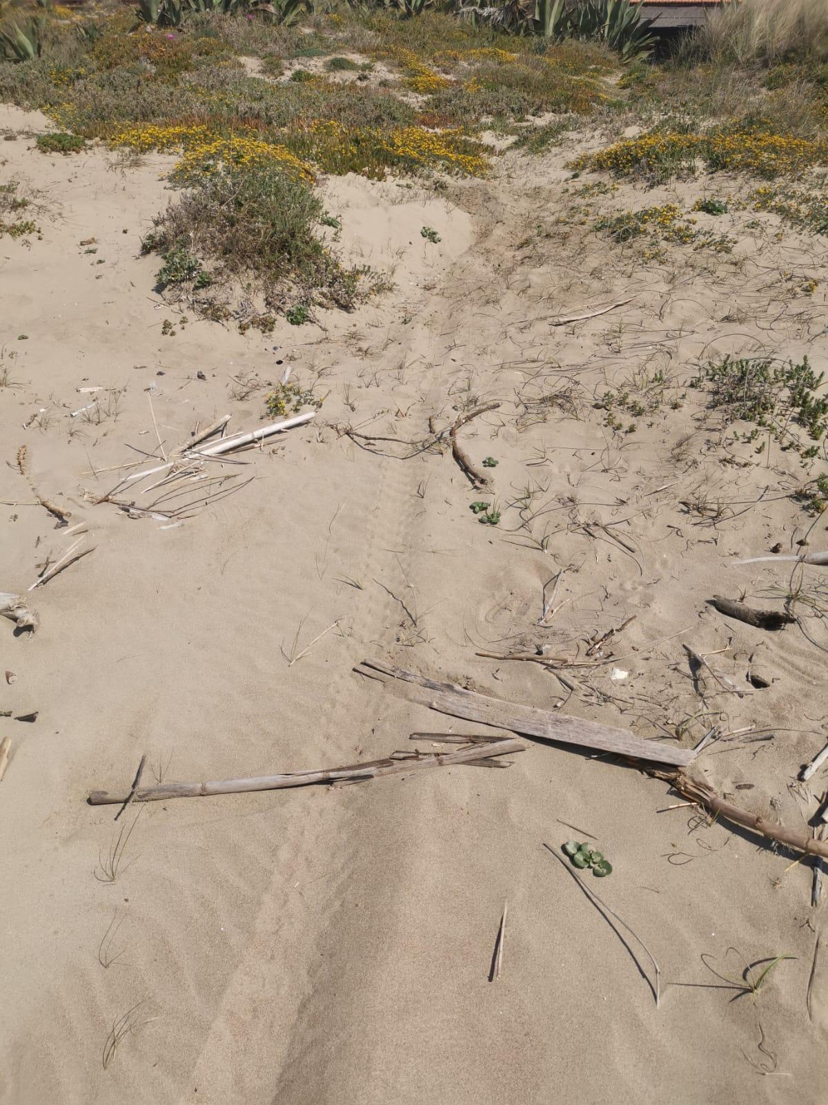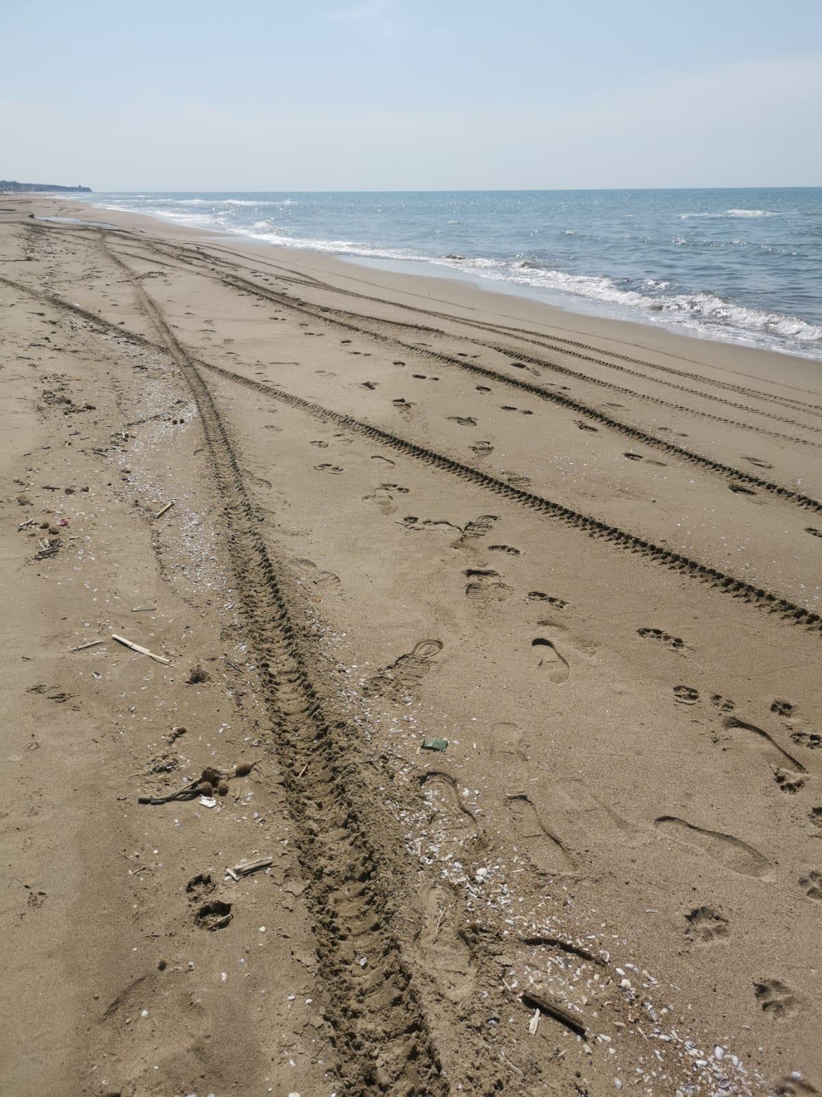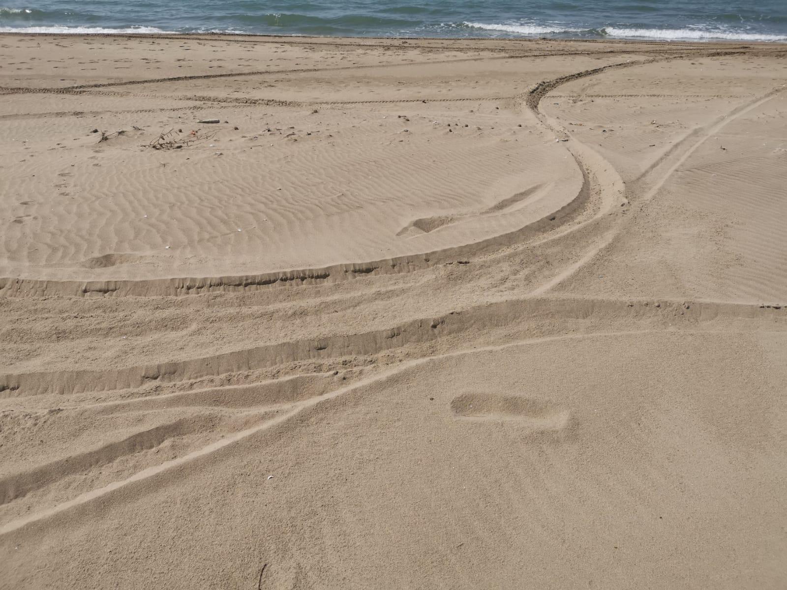 La persona a bordo della moto ha fatto diversi giri in riva al mare, come dimostrano le impronte lasciate sulla sabbia che vi mostriamo nelle foto, contravvenendo all’ordinanza sindacale che vieta ogni tipo di attività sull’arenile, poi si è allontanata.
