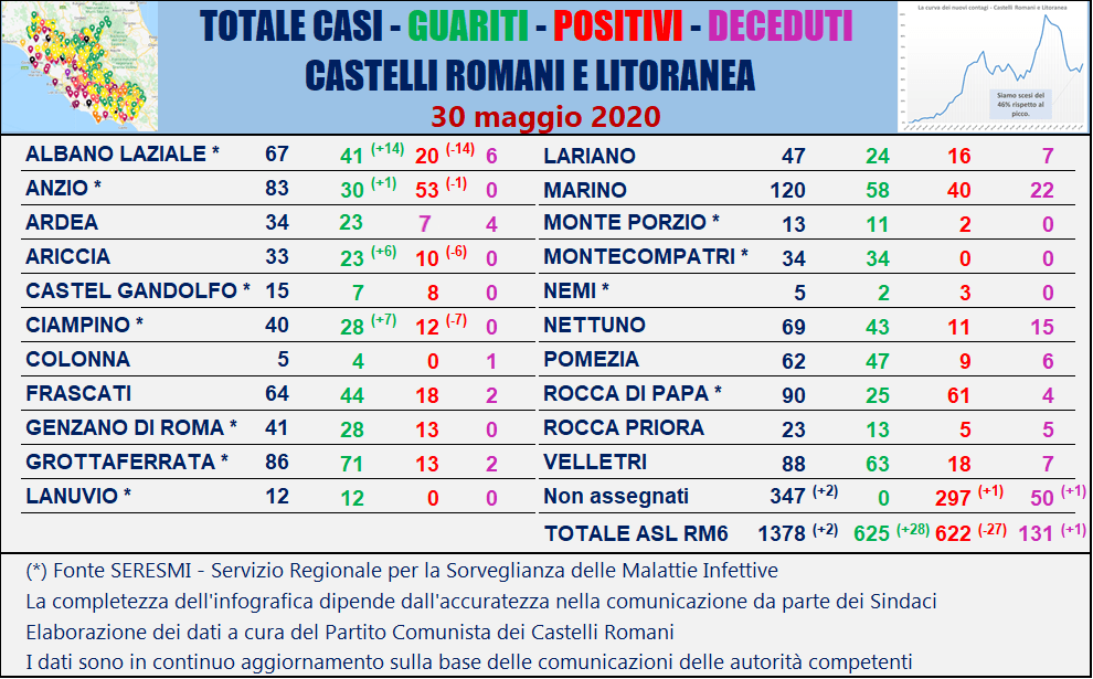 Nella ASL RM6, che comprende i Castelli Romani e la Litoranea, il 30 maggio è continuato il trend molto positivo di rallentamento del coronavirus: 2 nuovi casi, 28 guariti, 1 decesso. Il numero complessivo dei guariti è salito a 625 (+28), il numero delle persone attualmente positive è sceso a 622 (-27), mentre il numero dei decessi è salito a 131 casi (+1). Rispetto al picco la curva dei nuovi contagi è scesa del 92%