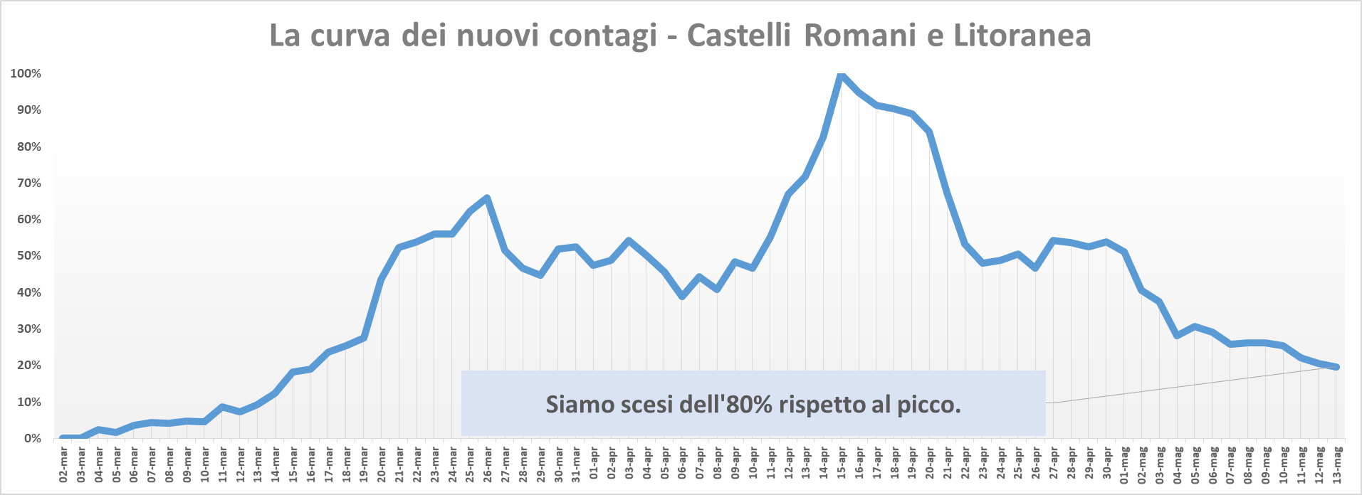 Casi di nuovo in leggere aumento nel Lazio. Trentotto i casi positivi nelle ultime 24h con un trend che risale allo 0,5%. Nella ASL RM6, che comprende i Castelli Romani e la Litoranea, il 13 maggio il numero dei positivi è salito a 1.286, con altri 10 nuovi casi, ma 40 guariti. Rispetto al picco del 15 aprile siamo scesi dell’80%.