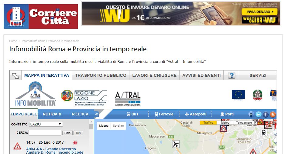 Il Corriere della Città è lieto di informare tutti i suoi lettori di una nuova, utilissima, sezione del proprio sito realizzata in collaborazione con Astral SpA: il portale infomobilità. All’interno dell’indirizzo https://www.ilcorrieredellacitta.com/infomobilita-roma-provincia-tempo-reale, comodamente raggiungibile dall’home page del sito, potrete trovare tutte le informazioni sul traffico in tempo reale, con tutti gli aggiornamenti sulla circolazione a Roma e provincia.