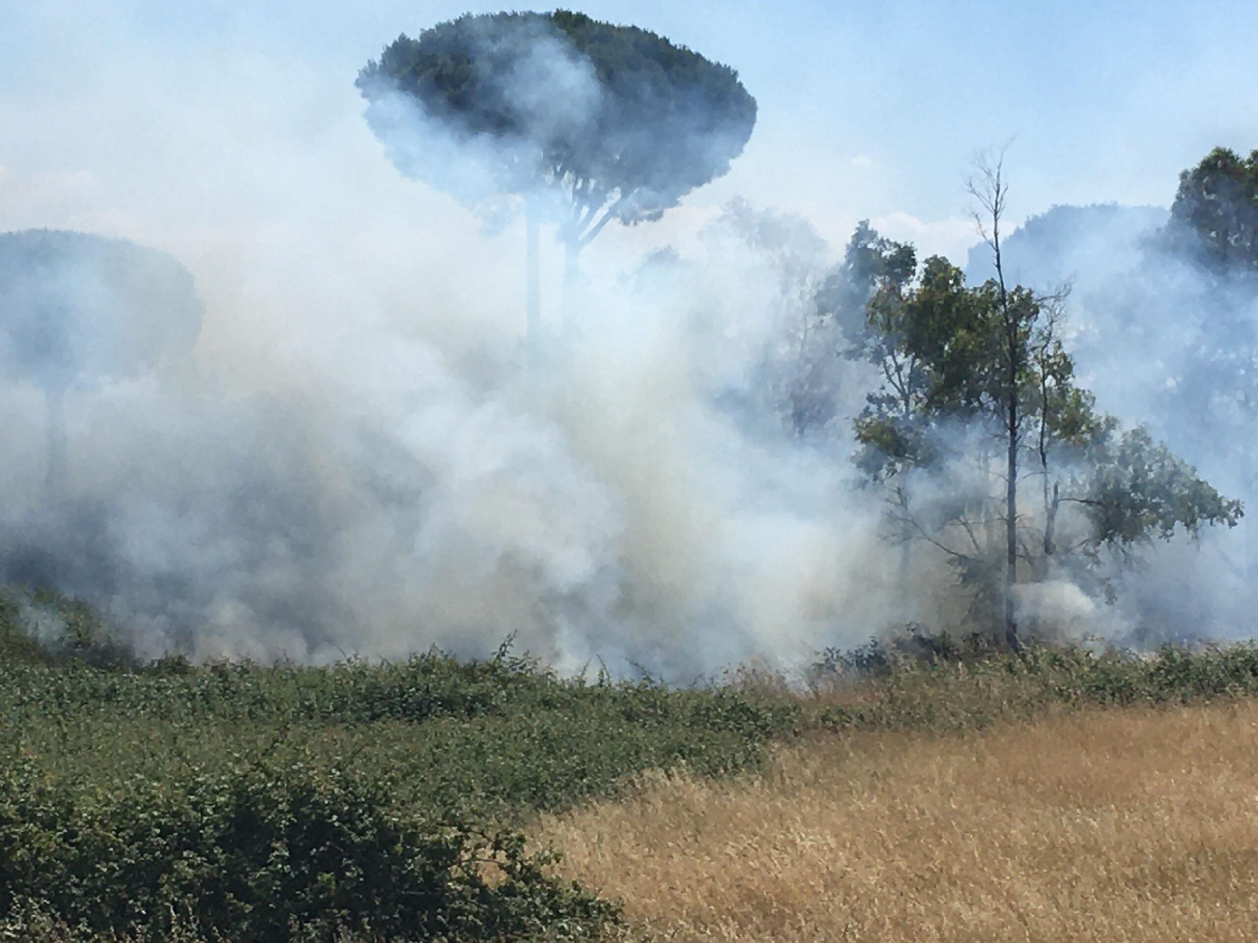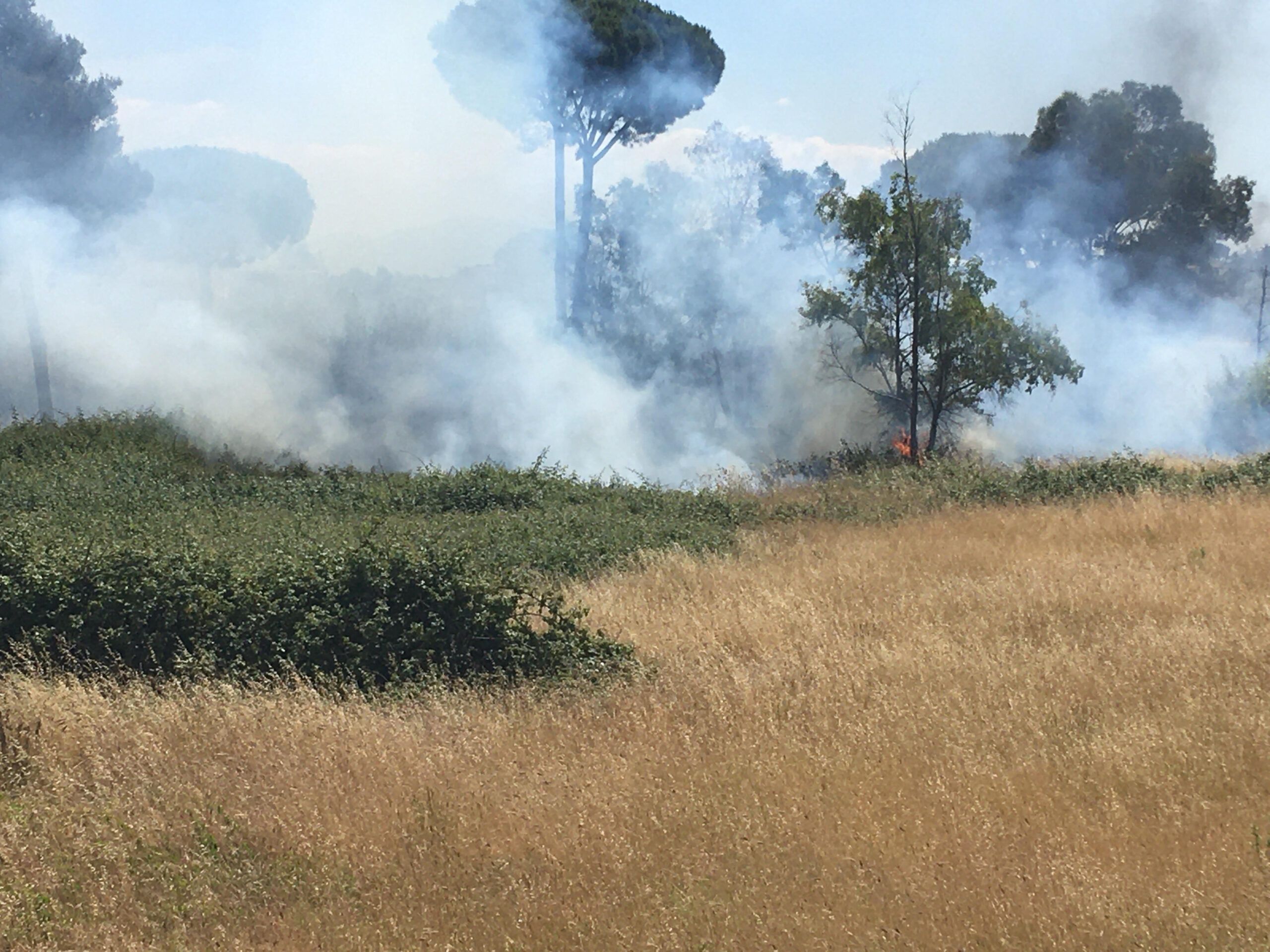 Incendio di sterpaglie in via dei ciclamini ad Aprilia, zona la Cogna. A fuoco un intero terreno incolto ad Aprilia, di quello che una volta era un ex campeggio. Le fiamme sono divampate in tarda mattinata. Sul posto, avvertiti dai residenti, sono intervenuti immediatamente i Vigili del Fuoco per domare l’incendio.