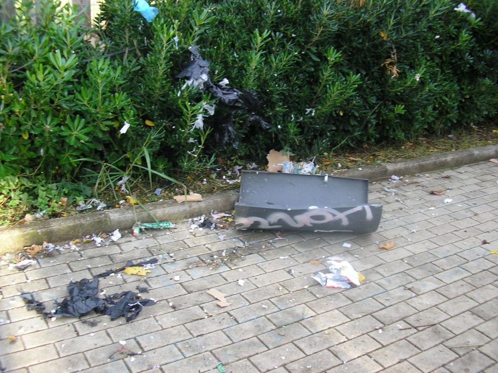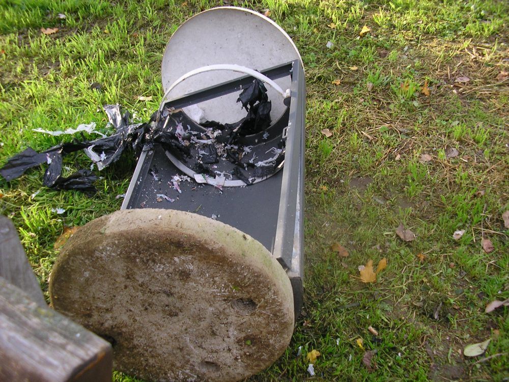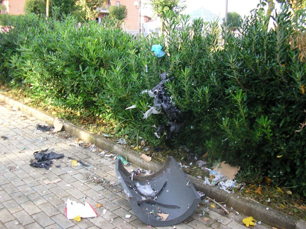 L’area verde ed il circondario in questione sono soggetti da qualche tempo ad una carenza di controllo che oltre a determinare quanto già premesso (non la dislocazione delle giostre, ovviamente) ha fatto sì che si sia assistito ad un crescendo di quelli che inizialmente erano scoppi di petardi ma che nel tempo sono sempre più sembrate piccole esplosioni che hanno raggiunto l’apice venerdì scorso, 25 novembre, quando un’esplosione ha mandato in pezzi un cestino metallico alto circa 130 cm con base in cemento proiettandone le parti a qualche metro di distanza e danneggiandolo irreparabilmente. Quanto avvenuto ultimamente mi fa riflettere sulla tanto pubblicizzata introduzione degli Ispettori Ambientali, tanto sbandierata e presentata in pompa magna dall’Amministrazione. Gli Ispettori Ambientali comunali rappresentano un corpo costituito da volontari con lo scopo di vigilare eventuali illeciti di natura ambientale e le aree verdi cittadine, e la loro presenza avrebbe di certo dissuaso anche atti di questo tipo, sebbene non di loro precipua competenza; peccato però che di essi pare se ne sia persa traccia! Spero che tale segnalazione sia tenuta nella dovuta considerazione al fine di incentivare i controlli e scongiurare ulteriori eventi che, se ulteriormente perpetrati, potrebbero finanche arrecare danni seri a persone o cose. Da quanto risulta allo scrivente del caso sopra descritto è stata informata la Polizia Locale che ha fatto i rilievi del caso ed avviato le indagini.