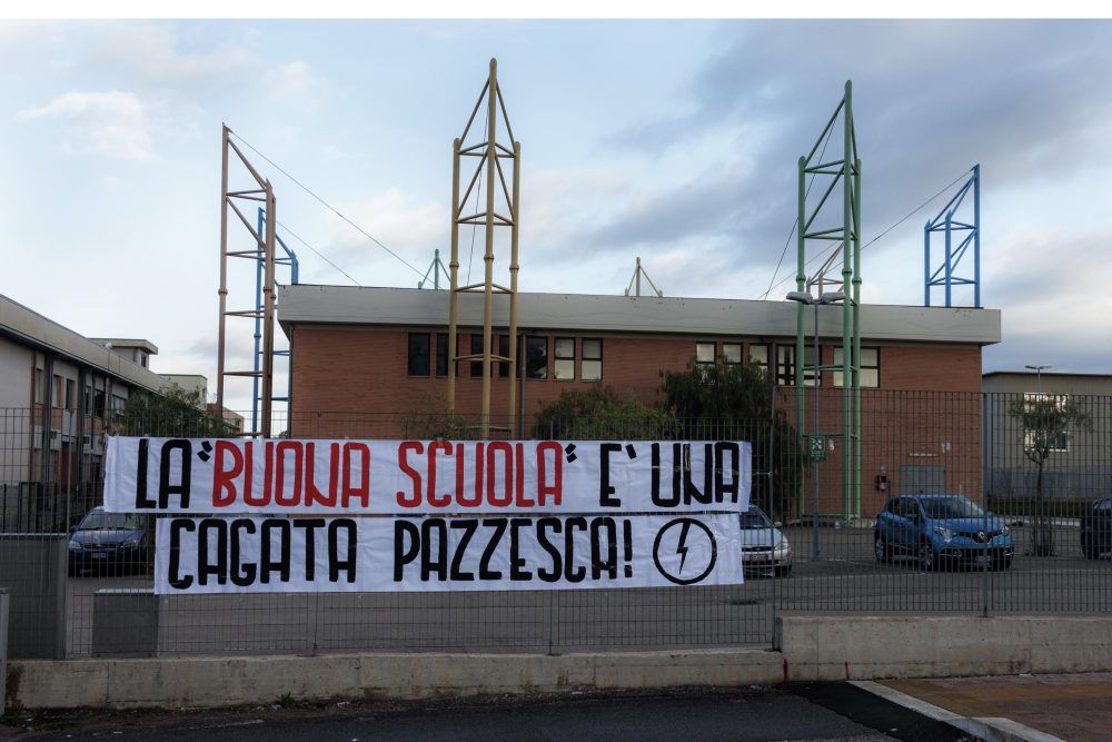 Questa mattina un sit-in fuori l’istituto Rosselli ha visto i militanti del Blocco Studentesco protestare insieme ai ragazzi contro la nuova riforma della scuola. I militanti hanno sventolato le bandiere, acceso fumogeni tricolore e insieme agli studenti srotolato uno striscione irriverente contro la riforma: “La Buona Scuola è una cagata pazzesca!”.