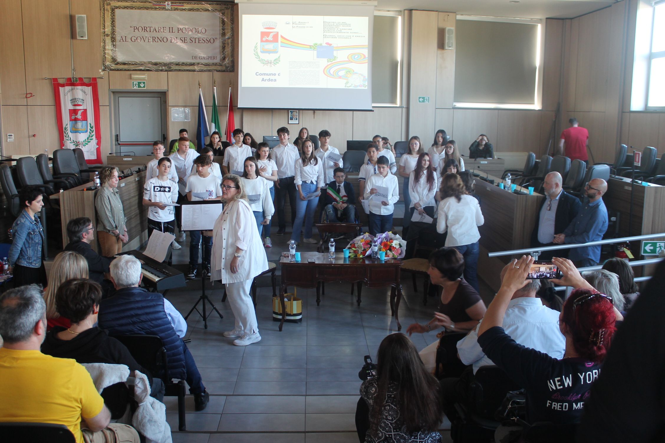 Sono intervenuti le massime autorità del paese, tra cui il sindaco Fabrizio Cremonini, il vice sindaco Lucia Anna Estero, l’assessore ai servizi sociali Geom. Simone Centore e diversi consiglieri comunali. Il sindaco, prima di dare inizio all’evento, si è tolto la fascia tricolore e l’ha fatta indossare a uno studente della scuola Virgilio che sedeva al posto a lui riservato durante l’assise consiliare. L’evento è stato coordinato dalla professoressa Roberta Galmacci Ciferri, che – visibilmente commossa – ha presentato anche il suo coro “Piccoli passi verso la musica” ed alcuni ragazzi della scuola “Virgilio”, che hanno tra l’altro letto alcuni passi del libro scritto da Anastasia. La professoressa Galmacci ha ringraziato il dirigente scolastico Prof. Carlo Eufemi, assente per impegni istituzionali inerenti alla sua dirigenza. La professoressa ha poi ringraziato tutti suoi colleghi presenti e tutti i collaboratori scolastici e quanti hanno contribuito al buon esito della manifestazione.
