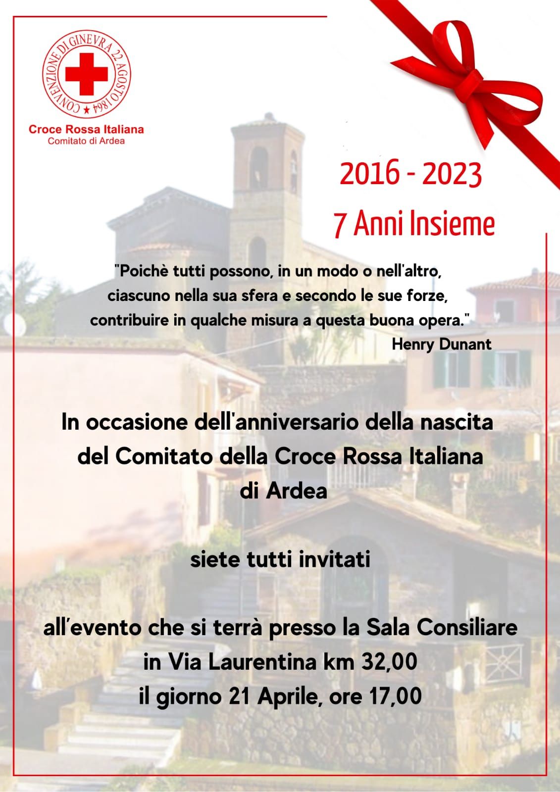 Sette anni insieme alla croce rossa di Ardea. Evento sotto la rocca per celebrare l’anniversario della fondazione del comitato locale CRI sul territorio comunale. Venerdì 21 aprile, presso l’aula consiliare di Via Laurentina al km 32, a partire dalle ore 17.00, si terrà un evento pubblico per festeggiare questo importante traguardo della Croce Rossa al livello locale. La cittadinanza tutta è invitata a partecipare. Ulteriori dettagli nella locandina di seguito riportata.