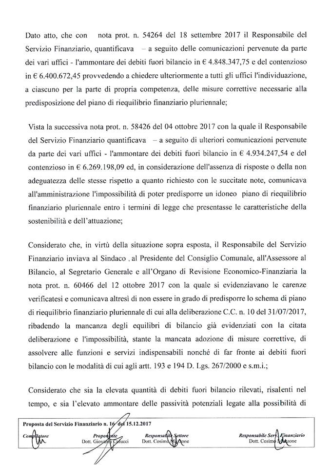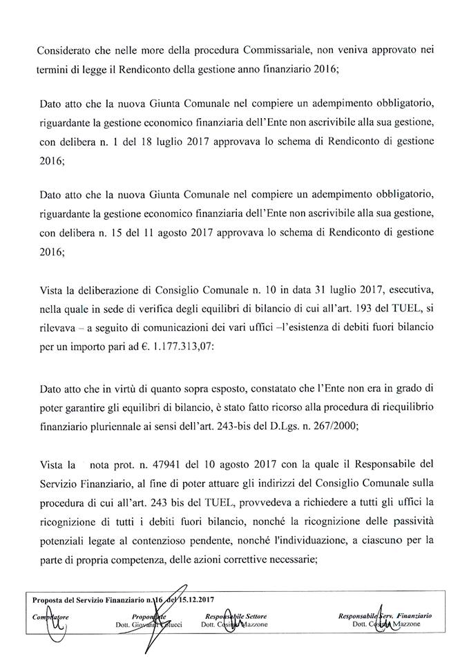 Le ragioni del dissesto, spiegate nella relazione presentata dal servizio finanziario, sono le stesse citate dal sindaco Savarese il 10 novembre nell’intervista video: troppi i debiti per pensare di poterli ripianare solo con il riequilibrio.