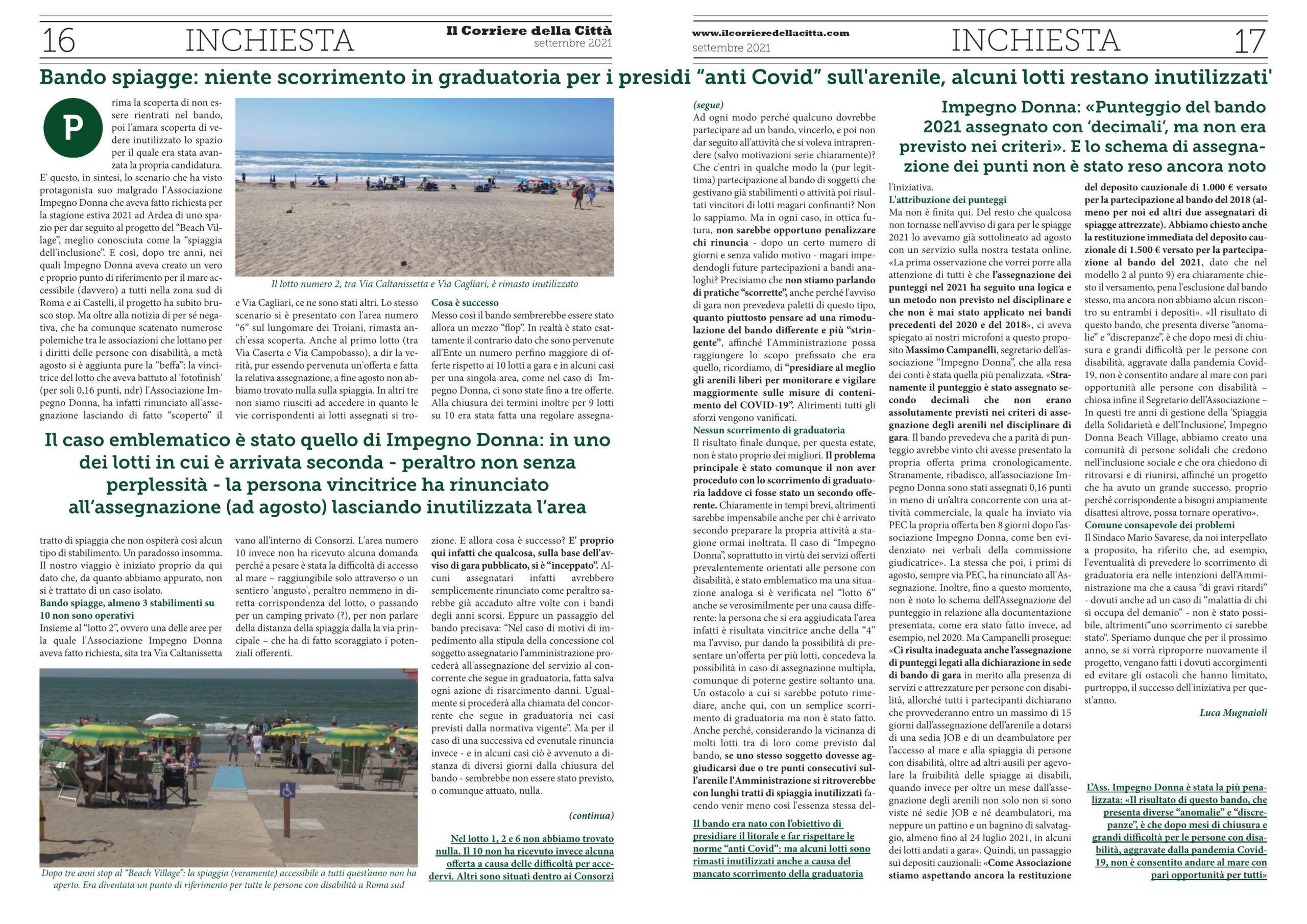 Ma non è finita qui. Del resto che qualcosa non tornasse nell’avviso di gara per le spiagge 2021 lo avevamo già sottolineato ad agosto con un servizio sulla nostra testata online. «La prima osservazione che vorrei porre alla attenzione di tutti è che l’assegnazione dei punteggi nel 2021 ha seguito una logica e un metodo non previsto nel disciplinare e che non è mai stato applicato nei bandi precedenti del 2020 e del 2018», ci aveva spiegato ai nostri microfoni a questo proposito Massimo Campanelli, segretario dell’associazione “Impegno Donna”, che alla resa dei conti è stata quella più penalizzata.