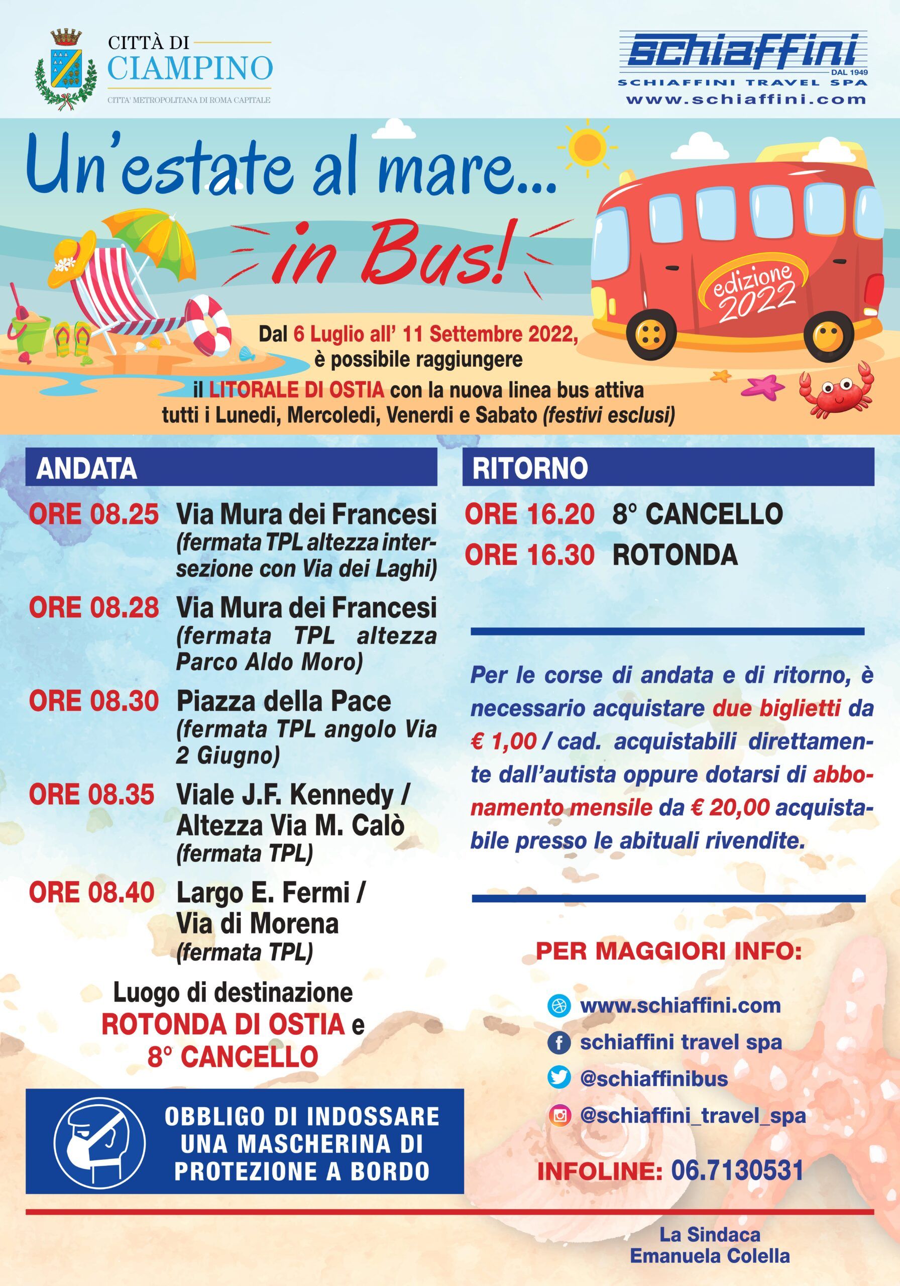 Partirà mercoledì prossimo 6 luglio l’iniziativa varata dal Comune di Ciampino denominata “Un’estate al mare… in bus”. Il progetta mira a rendere possibile il raggiungimento del litorale di Ostia con la nuova linea bus che sarà attiva tutti i lunedì, mercoledì, venerdì e sabato (festivi esclusi). Il servizio – promosso dal Comune di Ciampino in collaborazione con Schiaffini Travel Spa – sarà attivo fino all’11 settembre.