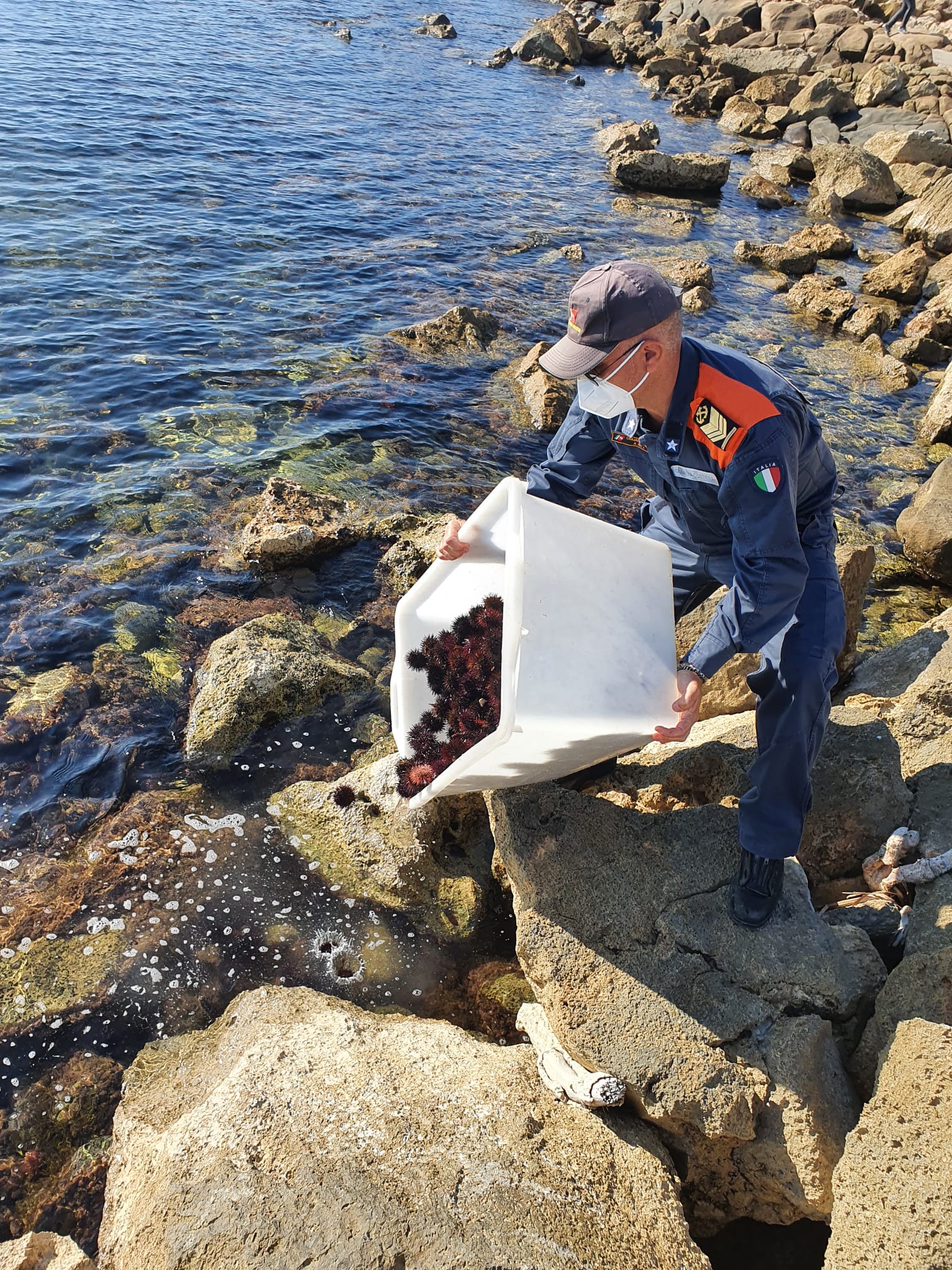 Il pescato, ancora vivo e vitale, veniva successivamente rigettato in mare, arginando in tal modo ulteriori danni al delicato ecosistema marino della costa e tutelando di fatto gli operatori che, autorizzati, esercitano lecitamente e nel pieno rispetto delle risorse la pesca del riccio di mare.