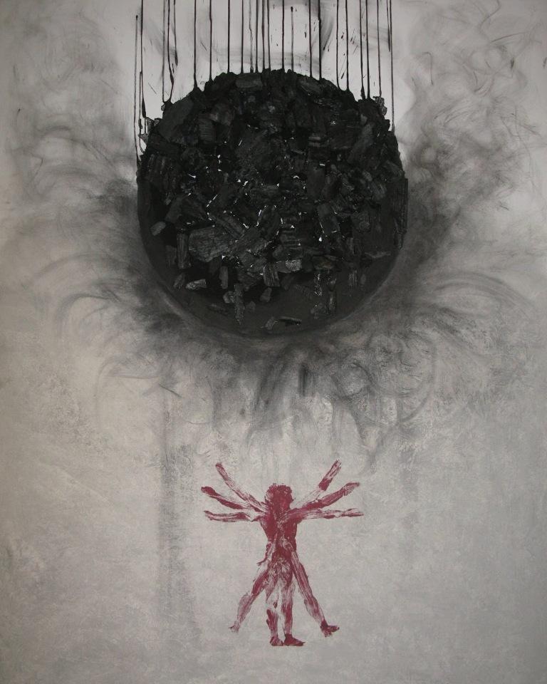 Ancora una volta il carbone, materia principe dell’artista, questa volta macchiato di rosso, è assunto a simbolo del degrado dell’animo.
