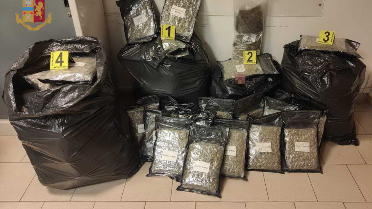 Il conducente, unico occupante del mezzo, è apparso subito nervoso ed insofferente e così i poliziotti, che hanno sin da subito sentito un forte odore di marijuana uscire dall’abitacolo, hanno approfondito l’accertamento procedendo a una perquisizione veicolare. Dentro la macchina, all’interno di 5 sacchi neri da giardino, erano nascoste 110 buste termo saldate contenenti 63 chili e 350 grammi di marijuana: il giovane è stato quindi arrestato in quanto gravemente indiziato del reato di detenzione, ai fini di spaccio, di sostanze stupefacenti.