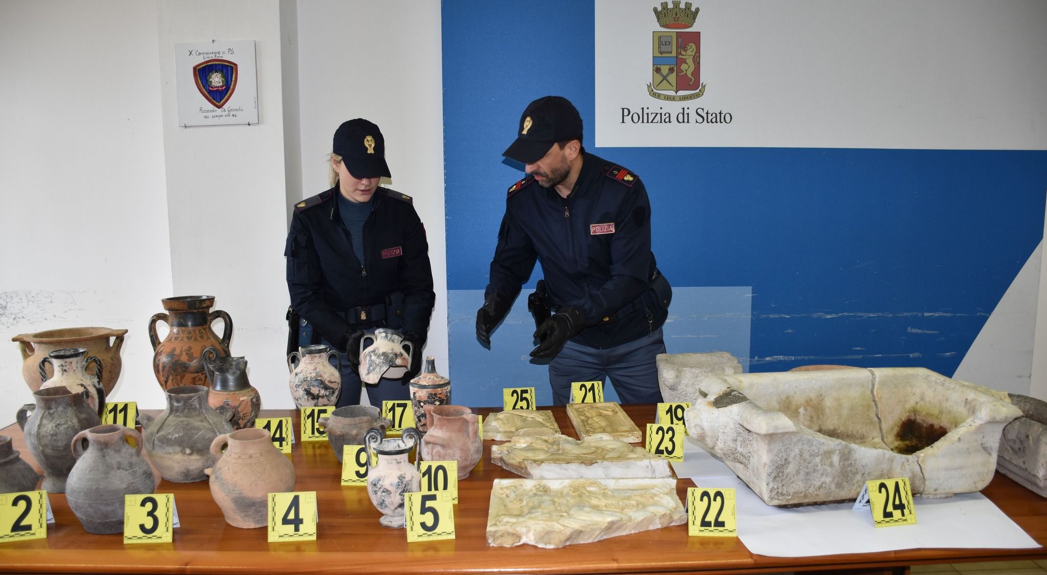 Sono stati gli agenti della Polizia di Stato del X distretto Lido a denunciare in stato di libertà una persona per ricettazione di beni culturali. In un garage utilizzato dalla persona denunciata sono stati rinvenuti numerosi vasi e anfore di grande interesse storico. In una successiva perquisizione presso l’abitazione sono stati trovati e sequestrati ulteriori oggetti di interesse storico. Tra questi un mortaio, una coppa in pietra grigia, un vaso in pietra, una metopa rettangolare, una vasca in pietra, un basso rilievo raffigurante un volto e parti di figure maschili e femminili.