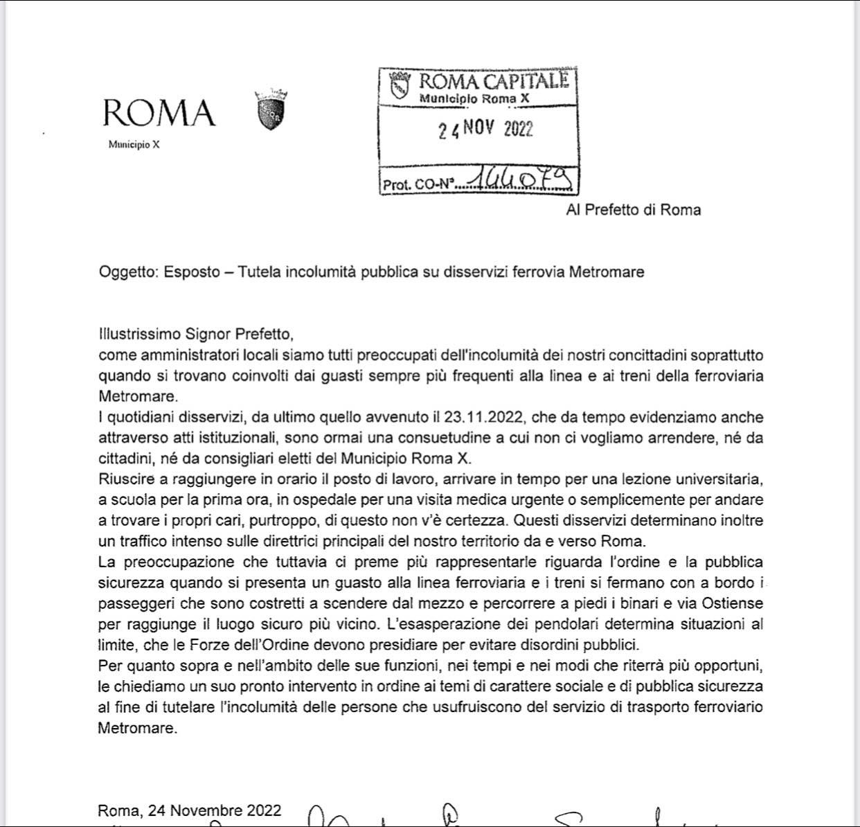 esposto dell'opposizione del X Municipio sulla situazione della Roma-Lido