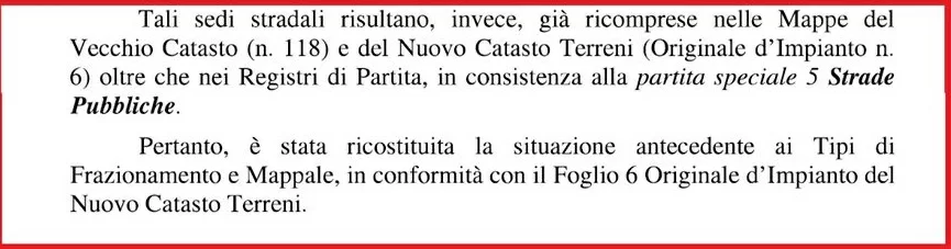 “Inoltre, l’esistenza documentata di uffici pubblici nel borgo (tra cui un ufficio postale, una stazione dei carabinieri, ecc.) e di regolare accesso a esso da parte della collettività anche con mezzi di locomozione, prima della recente apposizione di una provvisoria cancellata all’entrata del borgo in concomitanza con i lavori di restauro, depone per una presunzione di demanialità e mostra una oggettiva idoneità al soddisfacimento di una funzione pubblica, consistente nella possibilità di fruizione della rete viaria da parte della collettività delle persone in modo indifferenziato e senza l’impedimento di ostacoli riconducibili a contigue aree private”.