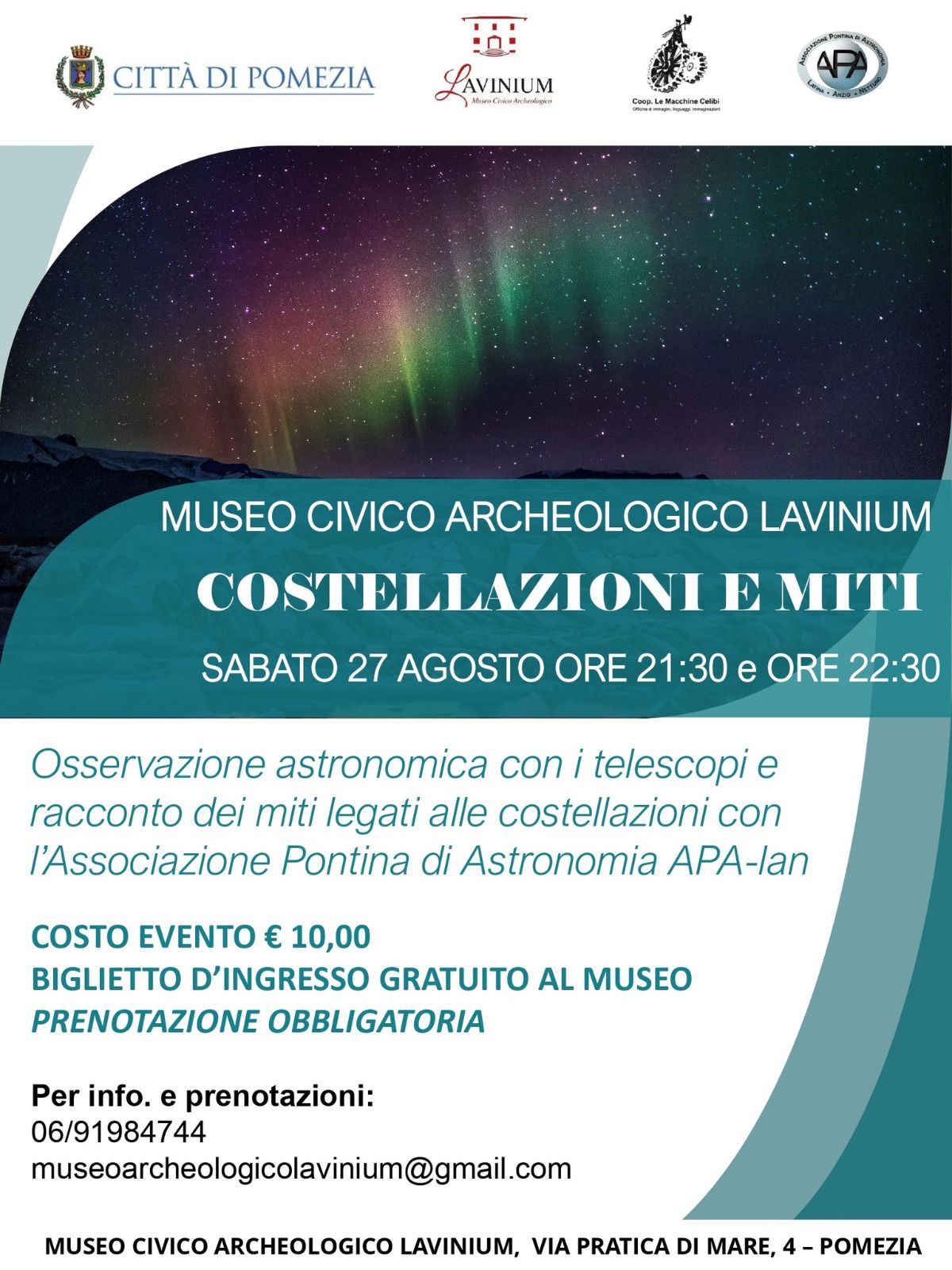 Pomezia. Sabato sera nella meravigliosa cornice del Museo Lavinium, dalle ore 21.30 alle 22.30, ci sarà “Costellazioni e miti”, osservazione astronomica con i telescopi e racconto dei miti legati alle costellazioni, in collaborazione con l’Associazione Pontina di Astronomia APA-lan.