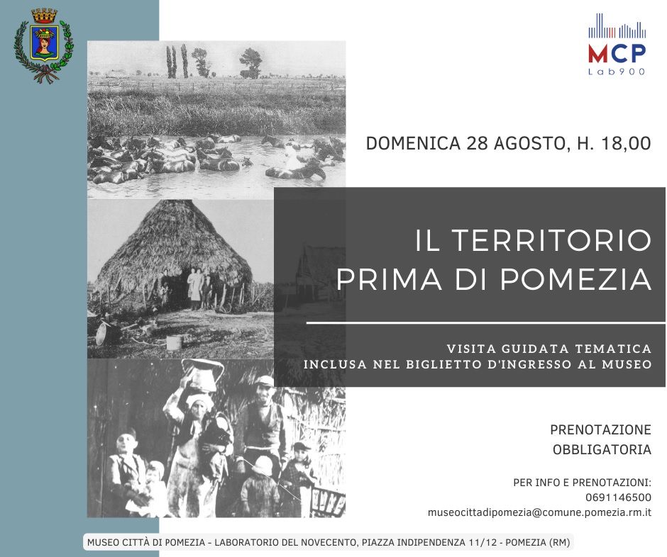 Al Museo Città di Pomezia – Laboratorio del ‘900, in Piazza Indipendenza, domenica 28 agosto alle 18.00  la visita guidata tematica “Il territorio prima di Pomezia”, viaggio  alla scoperta della storia del nostro territorio prima della grande opera di trasformazione seguita alla Bonifica integrale dell’Agro Romano e Pontino e alla costruzione delle “Città Nuove”.