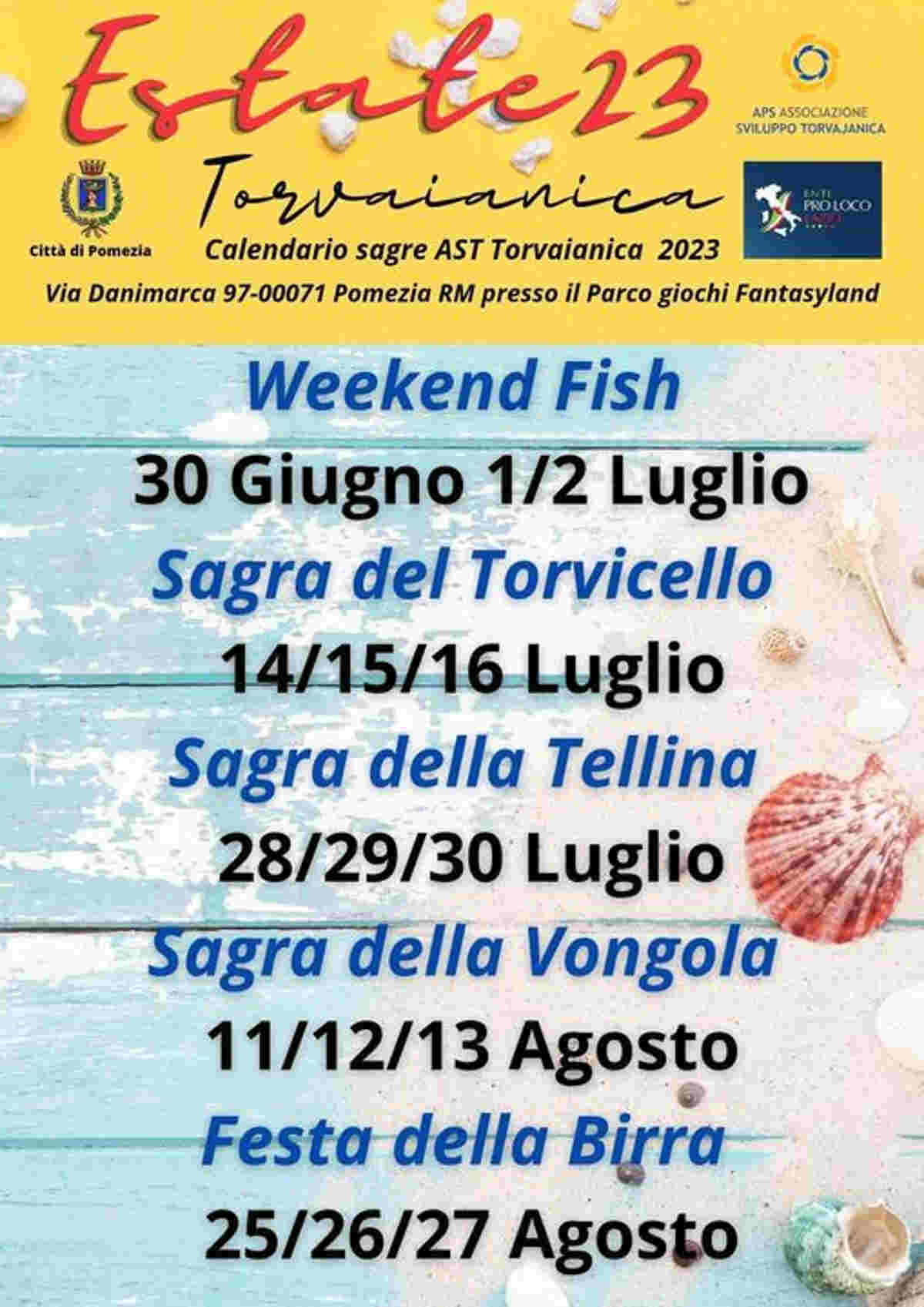 Non mancheranno poi, passando a Torvaianica, i tradizionali appuntamenti con le sagre che ormai da qualche anno caratterizzando l’estate pometina. Nell’ultimo weekend di giugno ci sarà Weekend Fish mentre a luglio tutti gli altri appuntamenti “classici”: dalla Sagra del Torvicello, a quella della Tellina, passando per la Festa della Birra. Ecco allora il calendario completo:
