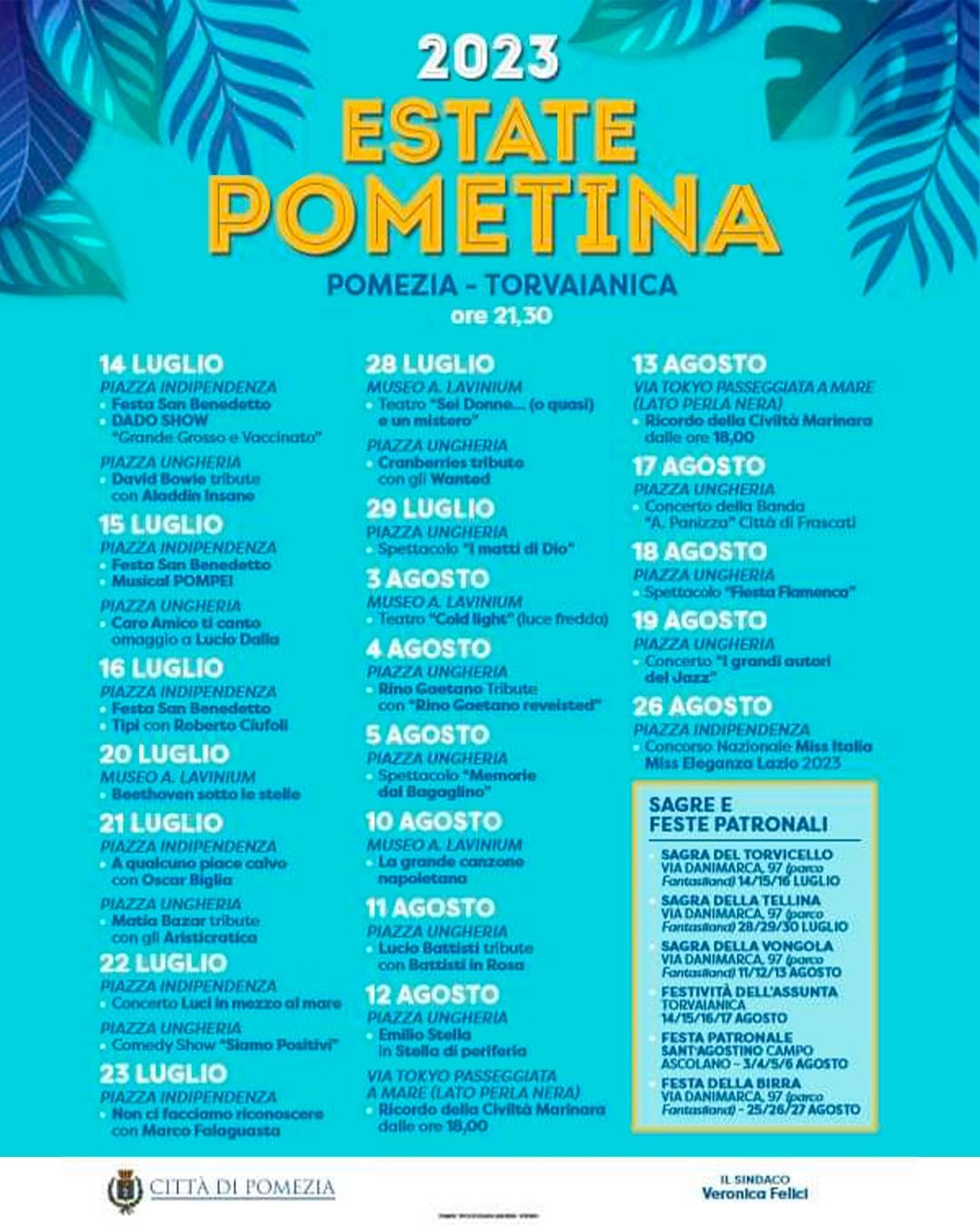 Nei giorni scorsi il Comune di Pomezia ha reso noto anche il resto del programma per quanto riguarda gli eventi estivi. Un format costituito da una ricca serie di eventi programmati dall’Amministrazione comunale, in collaborazione con i professionisti dello spettacolo, allo scopo di offrire momenti di divertimento e condivisione sia ai cittadini che ai turisti che trascorreranno le vacanze in Città. Qui il cartellone completo con tutti gli eventi delle prossime settimane.