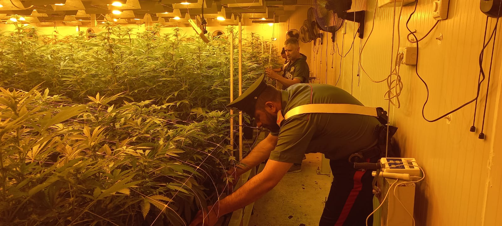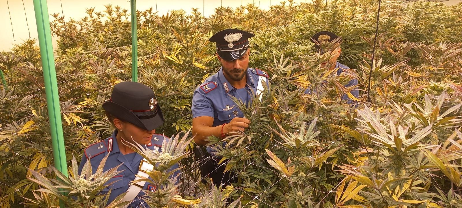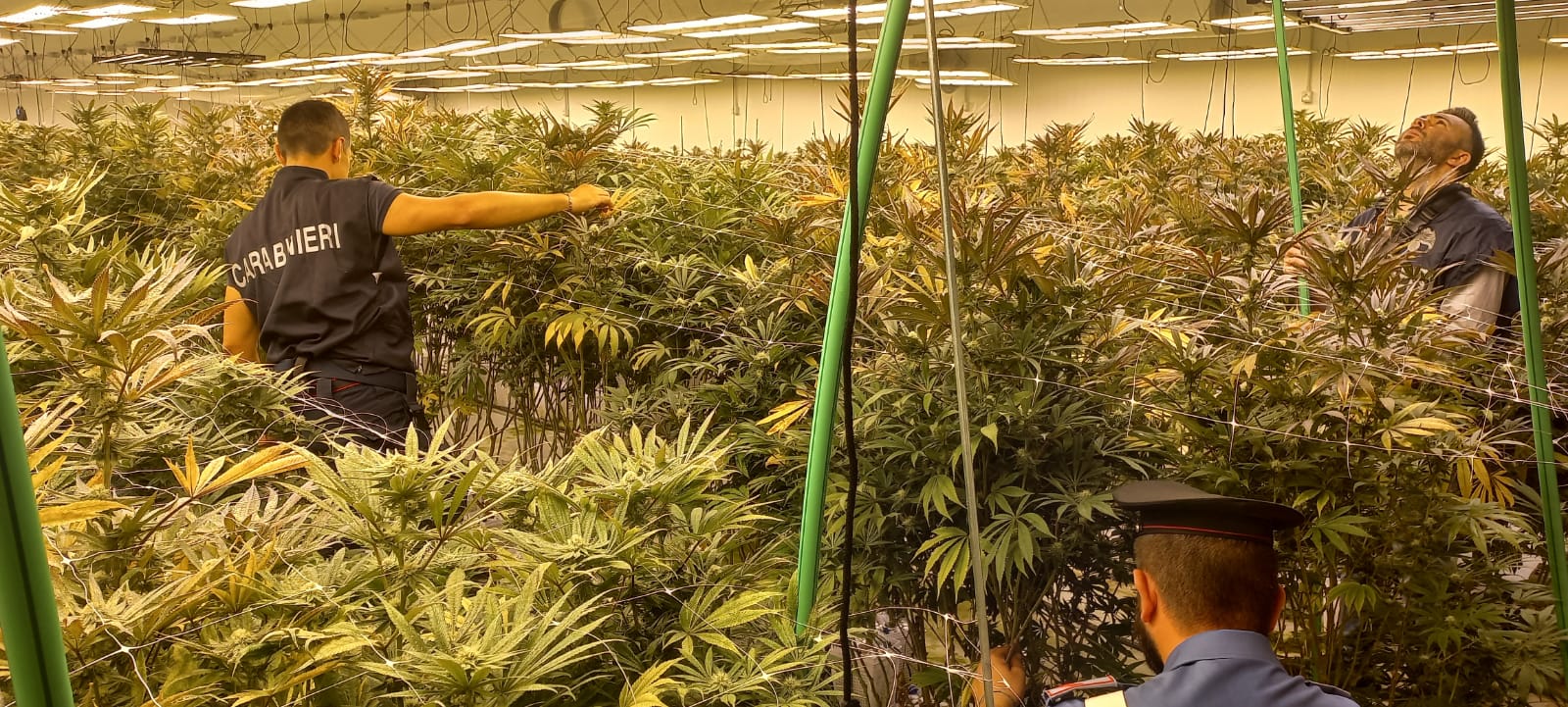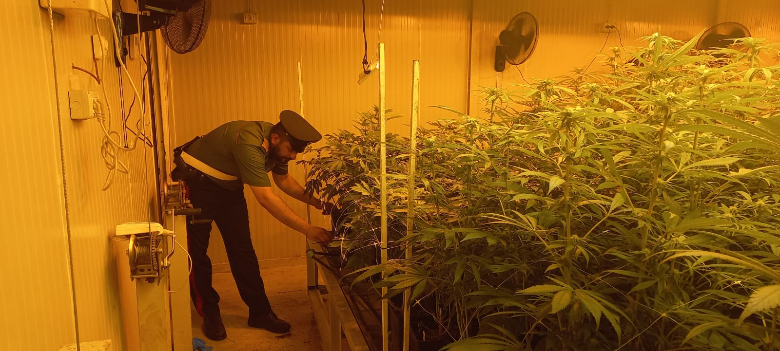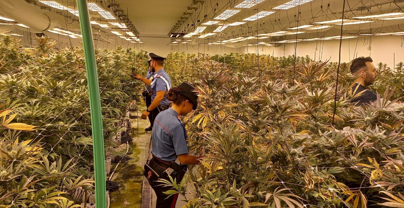 I Carabinieri, dopo i sospetti (risultati fondati con il senno di poi), hanno deciso di accedere alle strutture e qui hanno trovato due piantagioni per la coltivazione di cannabis, allestite con complessi e costosi sistemi di irrigazione, illuminazione e aerazione. Nel primo capannone i militari hanno sequestrato una coltivazione con all’interno 1.022 piante di varia altezza, compresa tra i 50 ed i 190 cm, e 1.100 piante già tagliate e in fase di essiccazione. Nel secondo, invece, una coltivazione di 1.550 piante in crescita di varia altezza, compresa tra i 10 ed i 100 cm, e 150 piante già tagliate e in fase di essiccazione, insieme a 15 sacchi di sostanza vegetale pronta per lo sfogliamento e 3 contenitori di infiorescenze.