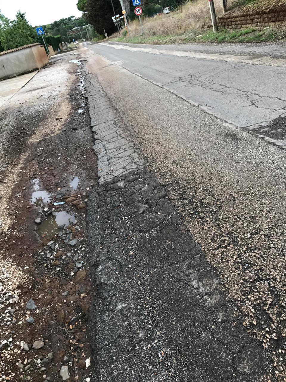 Le piogge di quest’autunno hanno peggiorato la situazione dell’asfalto, che è ormai in condizioni pericolose. Il pericolo è aumentato dalla strettezza della strada. Spesso le automobili sono costrette a manovre rischiose per far passare i camion che transitano sulla via. In una via appena sufficiente al passaggio di due macchine, questo rappresenta un problema non da poco. Speriamo che la segnalazione possa servire a portare l’attenzione degli organi competenti su questo tratto di strada.