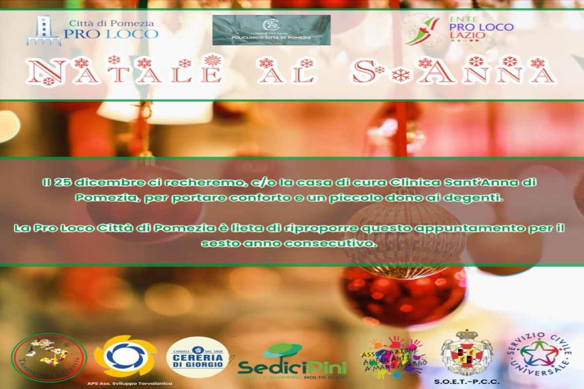 L’invito è esteso chiaramente a tutti i cittadini: “Vi invitiamo oggi, 25 dicembre, in clinica dalle ore 18.00”. L’iniziativa vede in prima linea l’Associazione Ambulanti a Mano a Mano, Tradizioni d’Italia, il centro Sedici Pini, il Roman Sport City, l’Associazione Sviluppo Torvaianica, la Cereria Di Giorgio, l’Ente Pro Loco Lazio Soet, PCC Valtevere Ente Pro-Loco Italiane.