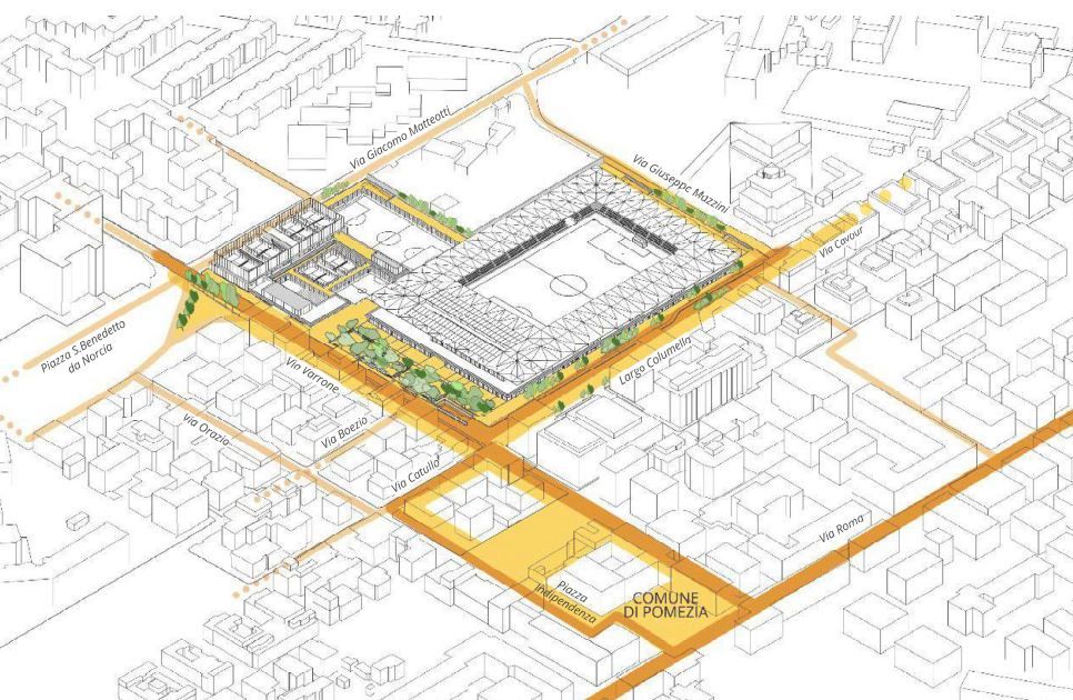 Il progetto per il nuovo stadio comunale dovrebbe andare a integrare il sistema di spazi che parte da Piazza Indipendenza e dovrebbe andare a costruire un polo intermedio verso piazza San Benedetto, area recentemente oggetto di interventi di riqualificazione con la demolizione della fontana e una nuova sistemazione dello spazio aperto. L’area di intervento, stando al progetto, viene completamente ripensata per integrare il nuovo stadio nel tessuto urbano: l’attuale Parco delle Rimembranze si evolve in una più ampia area verde pedonale tra via Columella e via Varrone, con l’ampliamento dell’area sportiva della Macchiozza che diventerà un nuovo centro polisportivo.