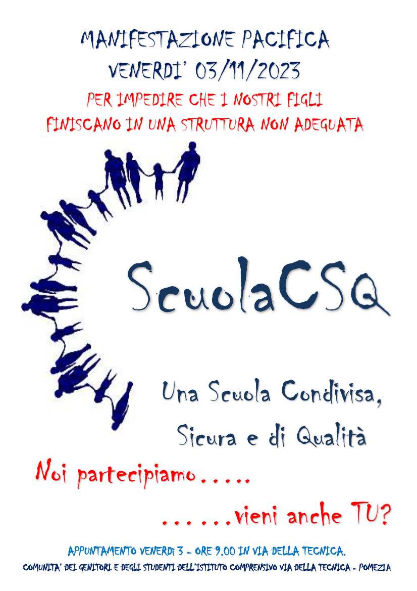 “Una scuola condivisa, sicura, e di qualità”. Questo lo slogan scelto per la protesta che andrà in scena venerdì 3 novembre a Pomezia: in piazza scenderanno le famiglie degli studenti della scuola Marone che a breve dovranno trasferirsi nella nuova sede di Via dei Castelli Romani come deciso dal Comune.